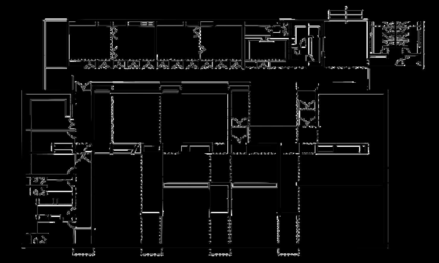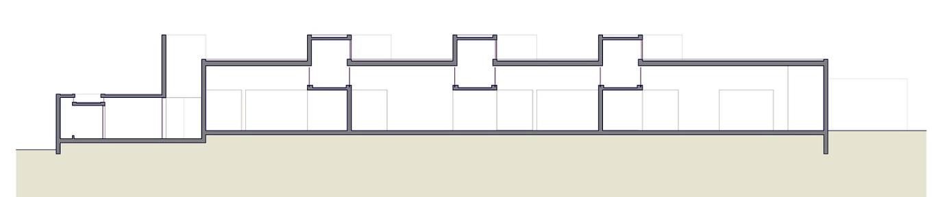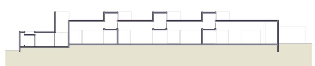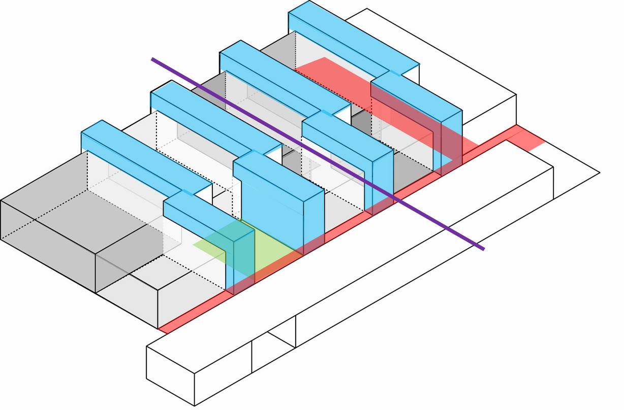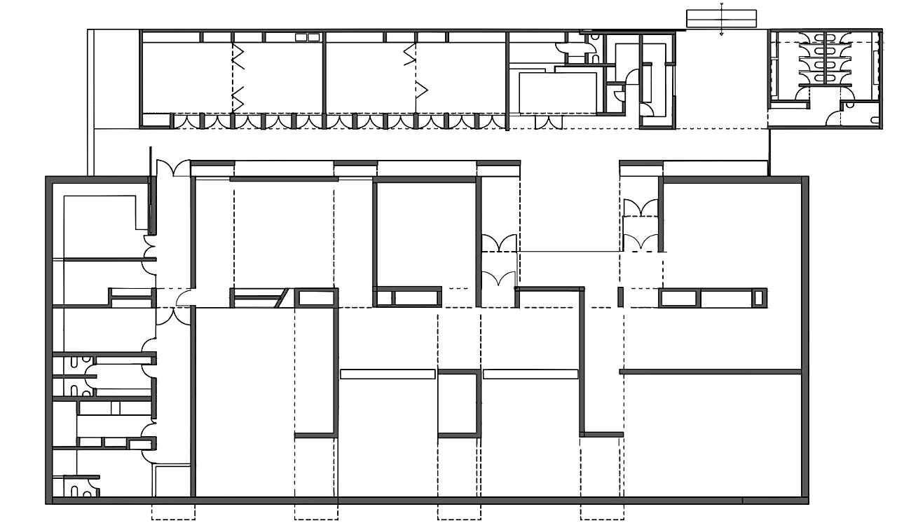 DOS VOLÚMENES PRISMÁTICOS SEPARADOS POR UN PASILLO Y AL MÁS GRANDE DE ESTOS LE HAN SIDO ADOSADOS 4 VOLÚMENES EN LA PARTE SUPERIOR