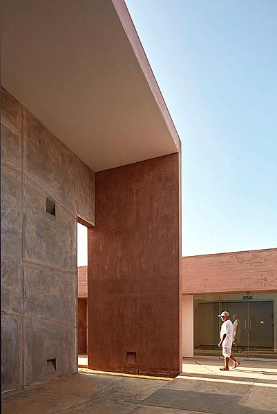 TAMBIEN OBSERVAMOS COMO LA TEXTURA EN SU EXTERIOR CONFORMADA POR HORMIGON ROJO DAN UNA AGRADABLE SENSACION POR ESTAR EN ARMONIA CON SU ENTORNO.