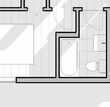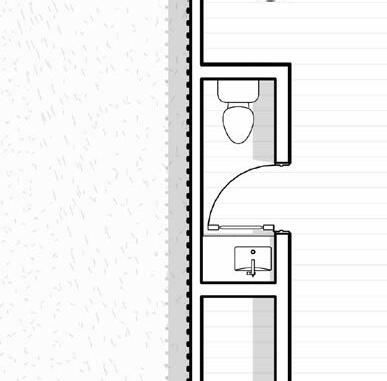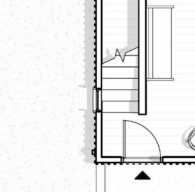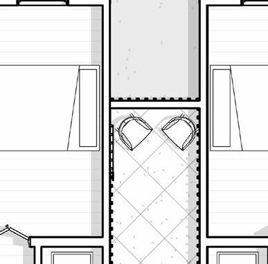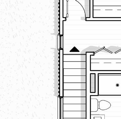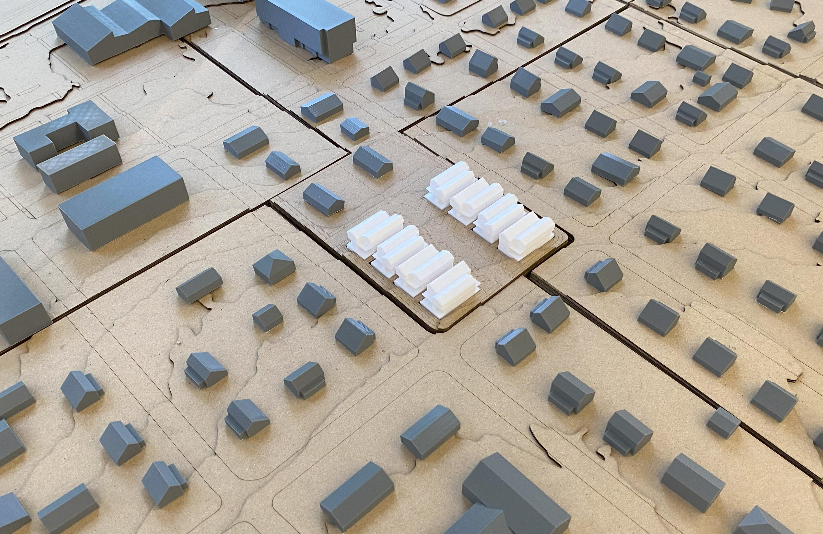 Duplexes provided the best balance between affordability and density while remaining reminiscent of the surrounding single-family homes. The “shifts” between the two halves of the duplexes emphasize individuality and pride in owning one’s home. Conversely, the idea of the front porch encourages community as an essential feature of the neighborhood and a transition zone from the public sidewalk to the private home. Maximizing front porch space greatly influenced the floorplans: to fit three bedrooms on the first floor while retaining usable front porch space, small cantilevers were introduced, additionally providing shade and visual depth.