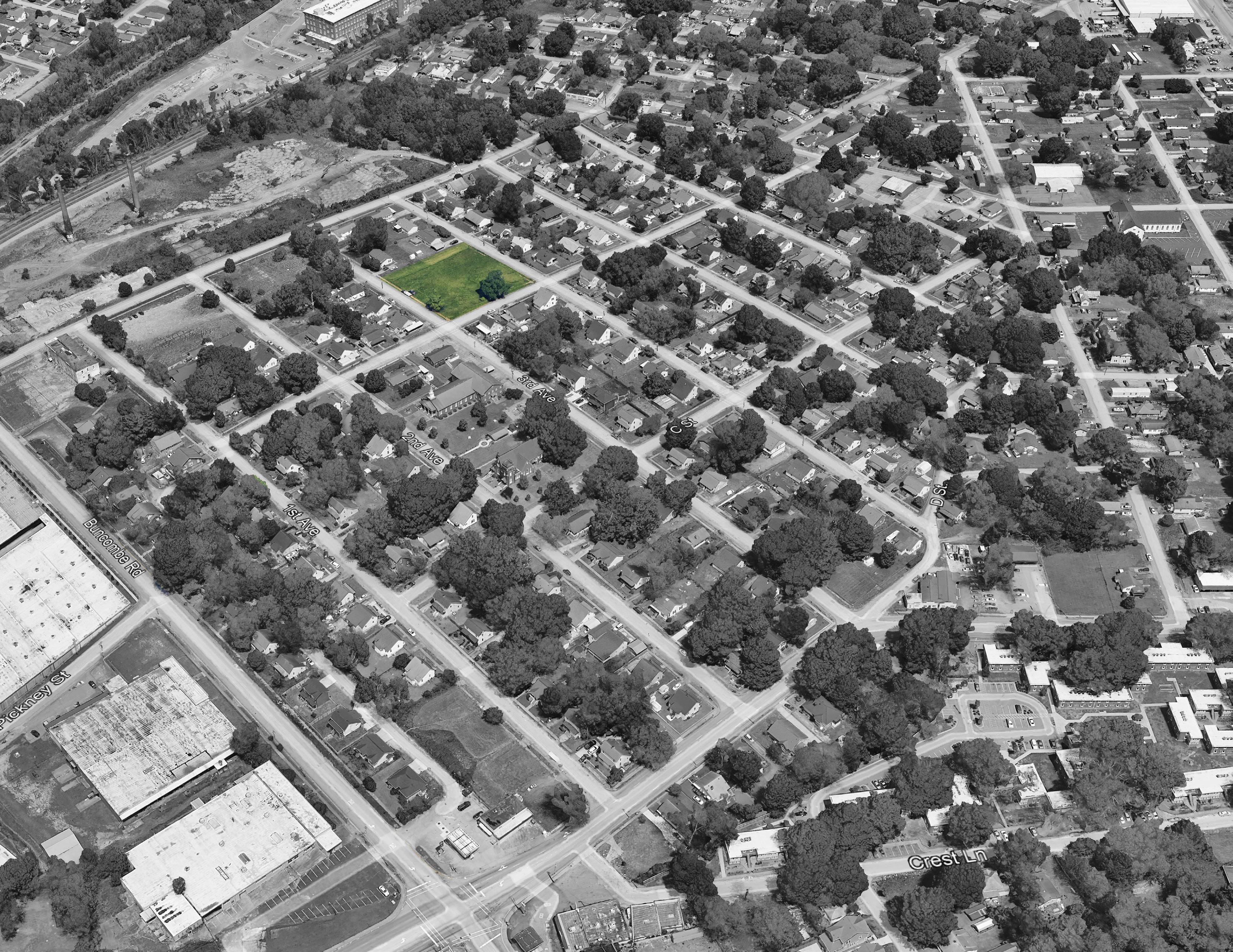 The mill school property sits at the end of a block bordered by 4th Avenue, B Street, and 3rd Avenue. The property encompasses about 40,000 ft² or around 4,000 ft² short of an acre and has remained undeveloped since the original mill elementary school was demolished. The site descends sixteen feet from the southernmost corner to the northernmost with neighboring houses resting on substantial foundations reached with four to five steps. Local homes are onestory with tall saltbox roofs reminiscent of their planning by northern mill developers. Most houses include a functional, full-width front porch that often serves as a “garage” for additional storage. Individual driveways and street parking are both used to store cars, but no enclosed garages are visible.