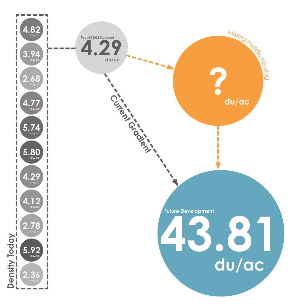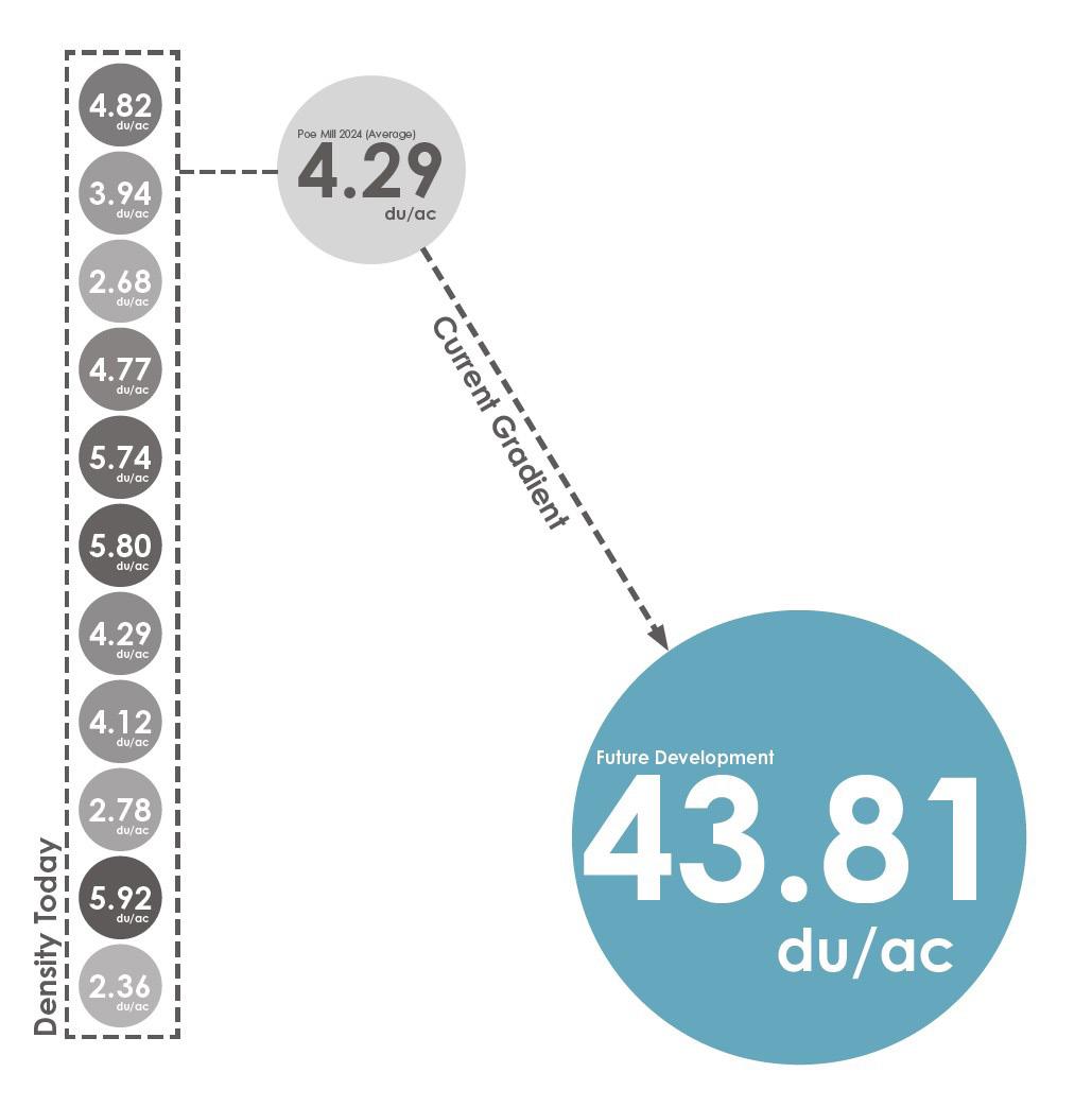 Due to the proximity of Poe Mill to Greenville city limits and its plans to already have major development similar to the “Nodes” system developed in the GVL 2040 document, it is reasonable to assume much of the same data holds true for this area. An ideal development in Poe Mill will likely have to fall in the range of 6.00 - 26.00 du/ac.