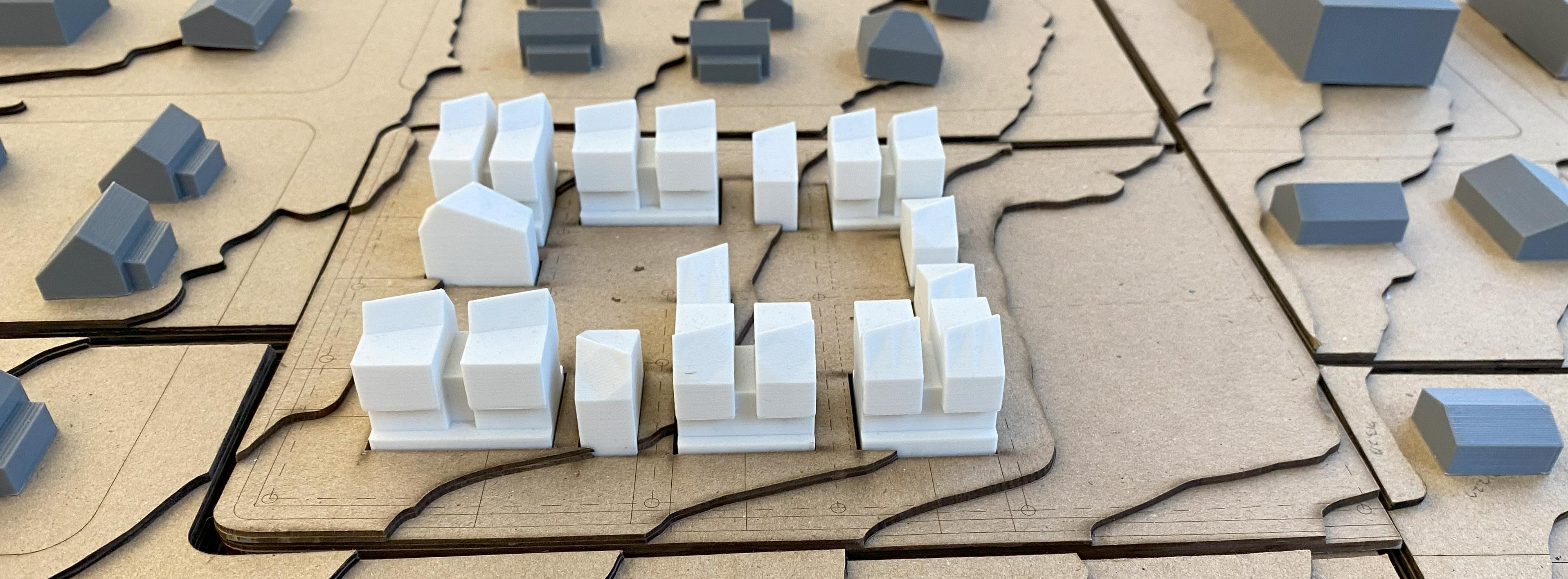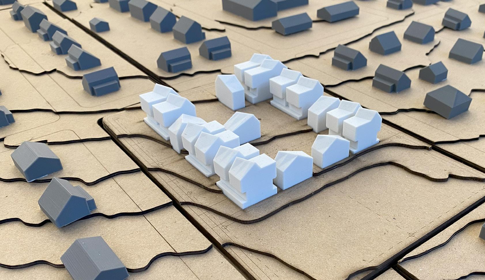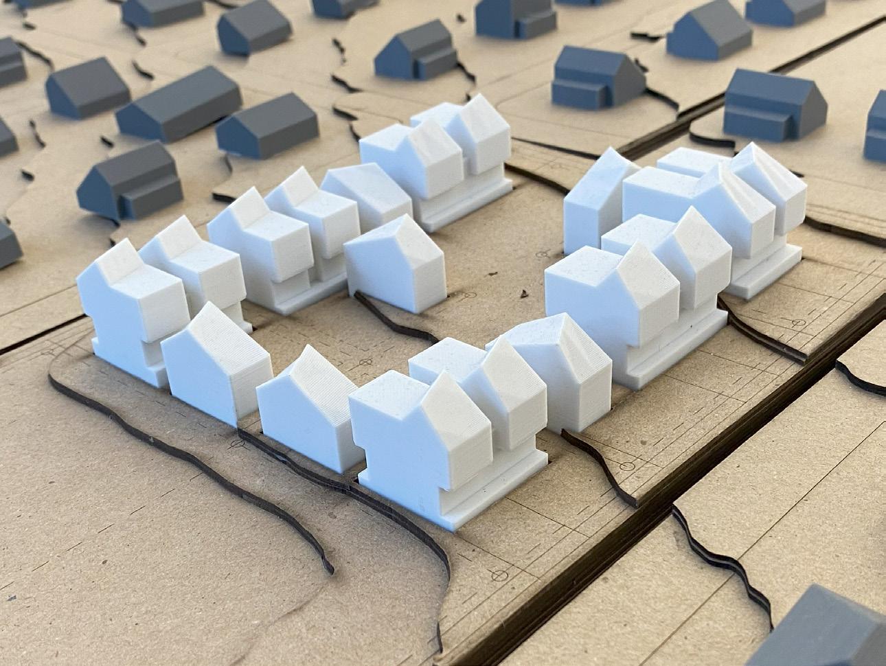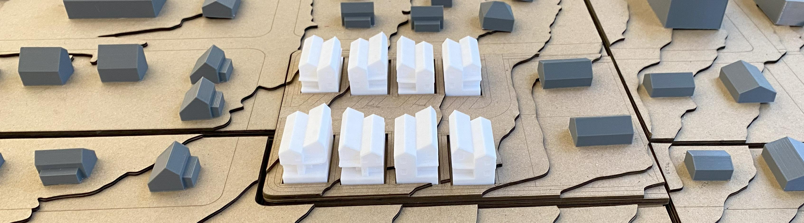 As a roadmap for its infill housing analyses and design proposals, the studio referred to one of the neighborhood master plans proposed by the earlier Poe Mill Thriving studio (2023) which itself drew from the 2009 Poe Mill Housing Revitalization Strategy authored by Poe Mill resident Rashida Jeffers. In addition to these resources, students, led by Joel Rogers, performed new density studies to understand and visualize the neighborhood’s capacity for new infill housing.