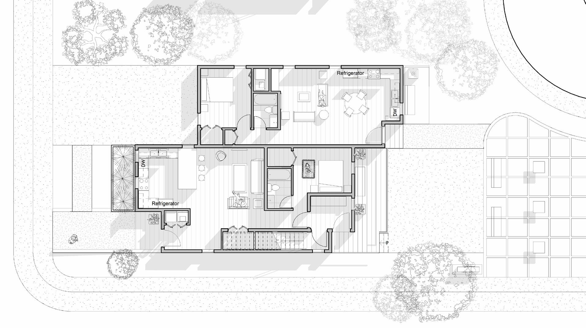 The overarching goal was to layout a site masterplan that respected the existing vegetation on the site as much as possible while also reaching the desired density range of 16-23 du/acre. The market rate footprints are between 1,440 - 1,750 sqft and the affordable between 544 - 560 sqft. Which unit is considered “affordable” and “market rate” is entirely up to the owner/developer. In this case, the affordable unit shown is the second, smaller portion of the duplex. The duplex is slightly larger on the market rate unit at the ground floor while both units are identical on the upper levels leading to increased efficiencies in construction. They are then joined by a semi-private outdoor patio on the upper level to lend a variety of outdoor spaces to each unit design.