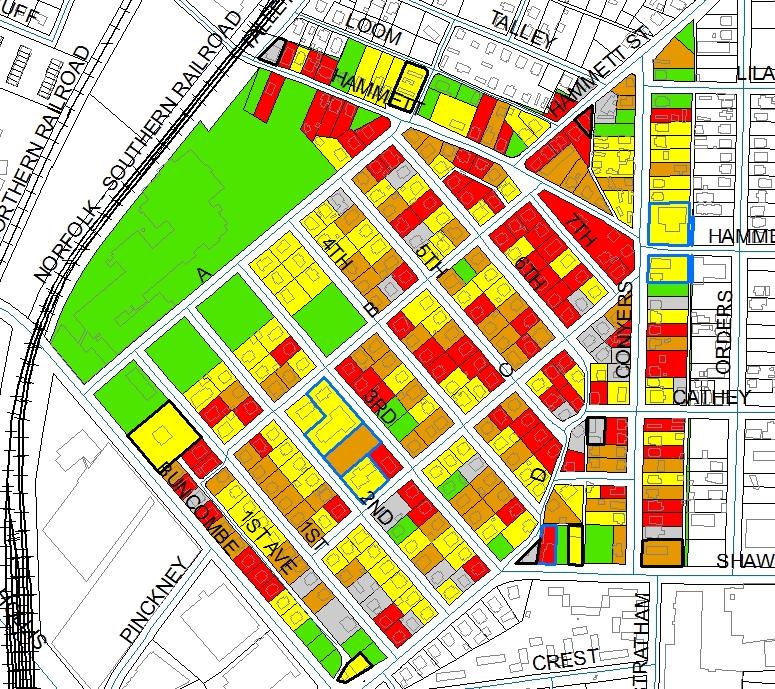 The classifications were based on exterior conditions that could be observed from the street such as the foundation, walls, roof, walls, windows, doors, steps, porches, lawn maintenance etc. According to GCRA Senior Construction Specialist, Dan Crumpton, the exterior condition of a residential building generally reflects the condition of its interior. The study area includes 326 parcels of which 24 are vacant, 15 are nonresidential and 287 are residential structures. Thirty-six percent of structures are standard, 24 percent require minor repairs, 30 percent require major repairs, and 10 percent are dilapidated. In short, 54 percent of residential buildings require some degree of rehab work and 10 percent need to be demolished