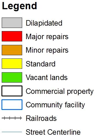 The buildings examined during the walking survey were classified as either standard (no repairs needed), minor repairs (or general maintenance such as torn screens and paint), major repairs (structural deterioration such as foundation, walls, or roof), and dilapidated (more cost effective to tear down rather than to repair). The survey did not include an examination of building interiors.