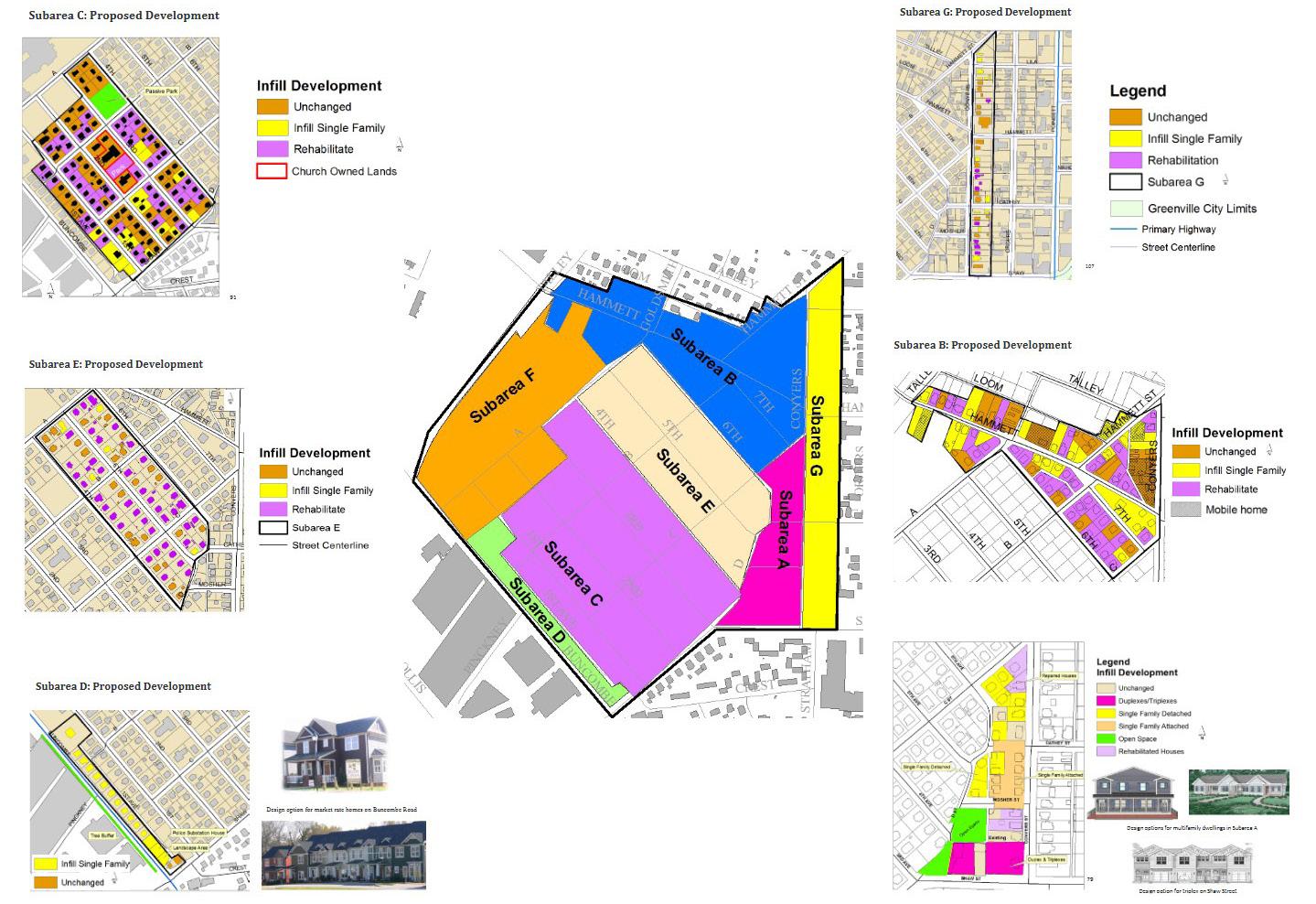 For her 2009 Master’s Thesis1 for Clemson University’s City and Regional Planning program, Rashida Jeffers conducted and documented a very thorough housing revitalization study for the Poe Mill neighborhood. Among numerous other topics, Jeffers, a Poe Mill resident herself, closely examined the conditions of existing houses and properties throughout the neighborhood and made related recommendations for rehabilitation, replacement and infill. The images on these two pages are excerpts from Jeffers’ thesis, and her entire manuscript served as a vital point of reference for both the 2024 At Home_In The Upstate studio and the 2023 Poe Mill Thriving studio. Studio master plan exercises and residential zoning and housing proposals followed closely from her recommendations, with some adjustments made based on changes which have occured in the neighborhood in the intervening years.