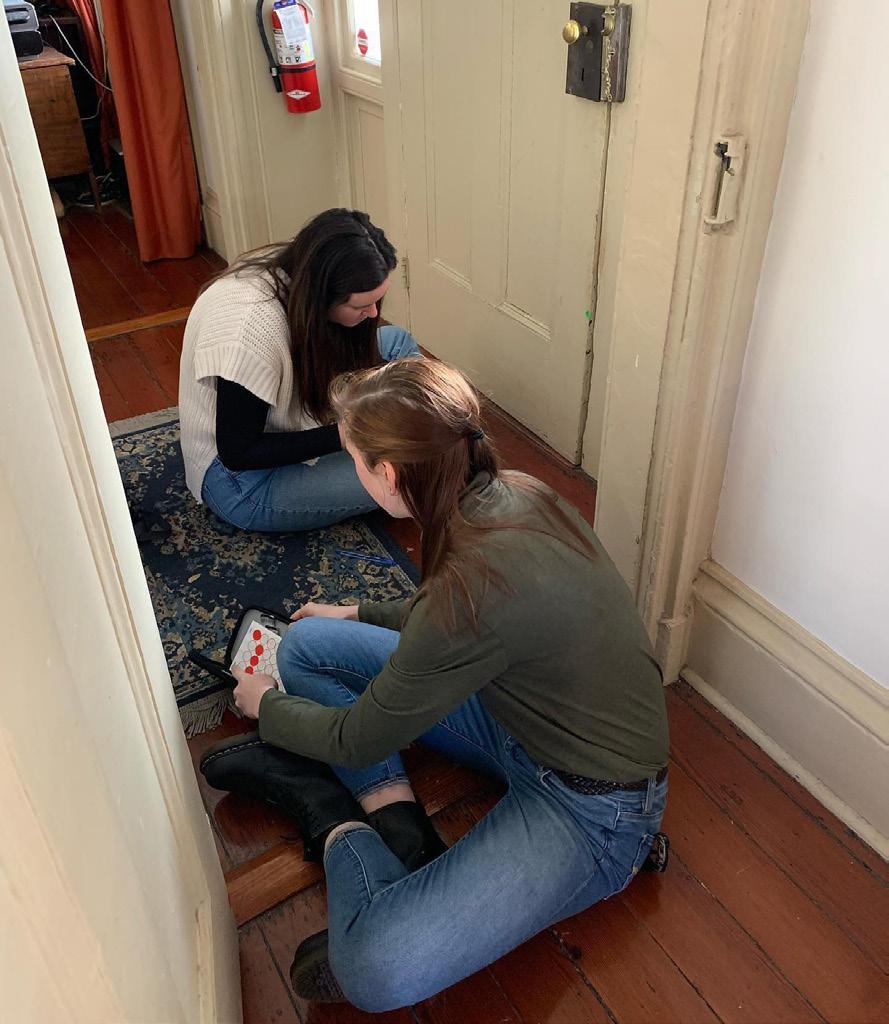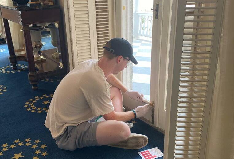 Students Luke Bagwell, Matthew Doohan, Joyce Pope, and Emma Grace Sprinkle took samples from five interior rooms of the Roper House for analysis. A report of their process and findings was compiled for Classical American Homes Preservation Trust. Through their analysis they discovered evidence of repeated paint color layers on some features in the rooms, including window surrounds and baseboards. Another finding of their analysis was a distinctive green color from the door surround of the foyer and a light blue color found in a second floor room.