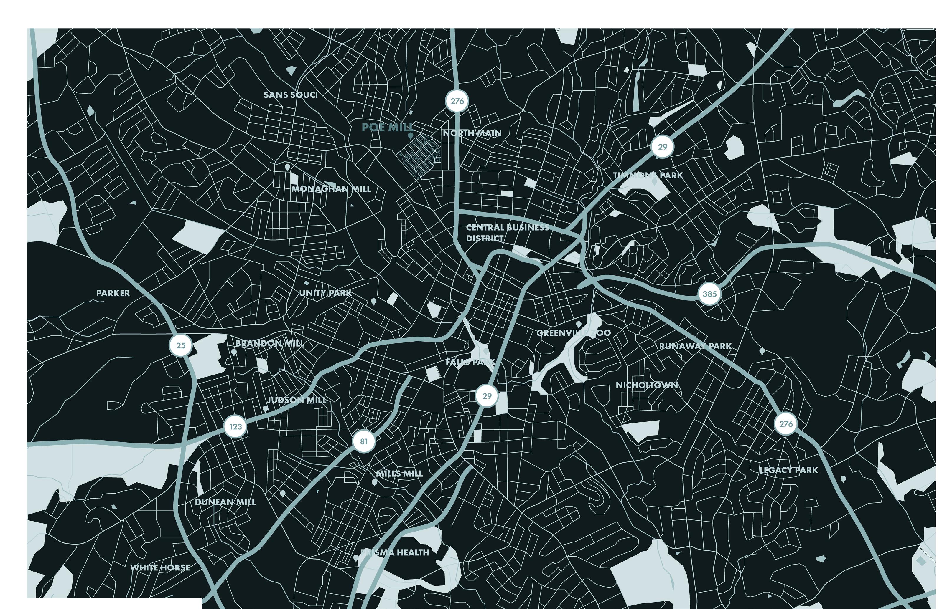 One of the goals of this Master Plan is to connect with neighboring communities. Here you see the figure ground overlayed by historic map information stemming from the 1920’s Sanborn Map and the 1882 Kyser Map. When combined, they tell the story of displacement and gentrification in Greenville’s mill history. The 1920’s Sanborn map overlaps the figure ground of Poe Mill to visualize what territory the old Poe Mill covered.