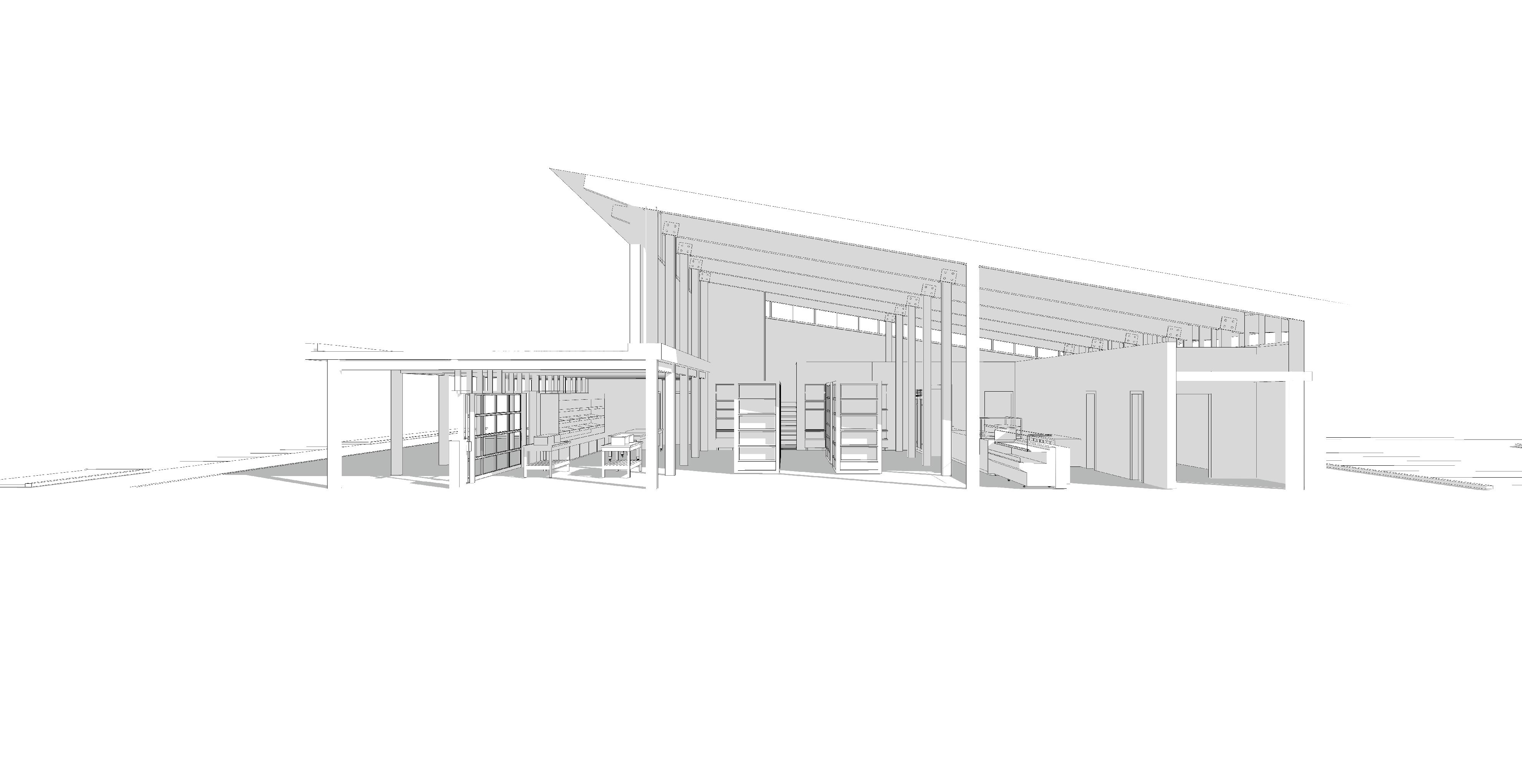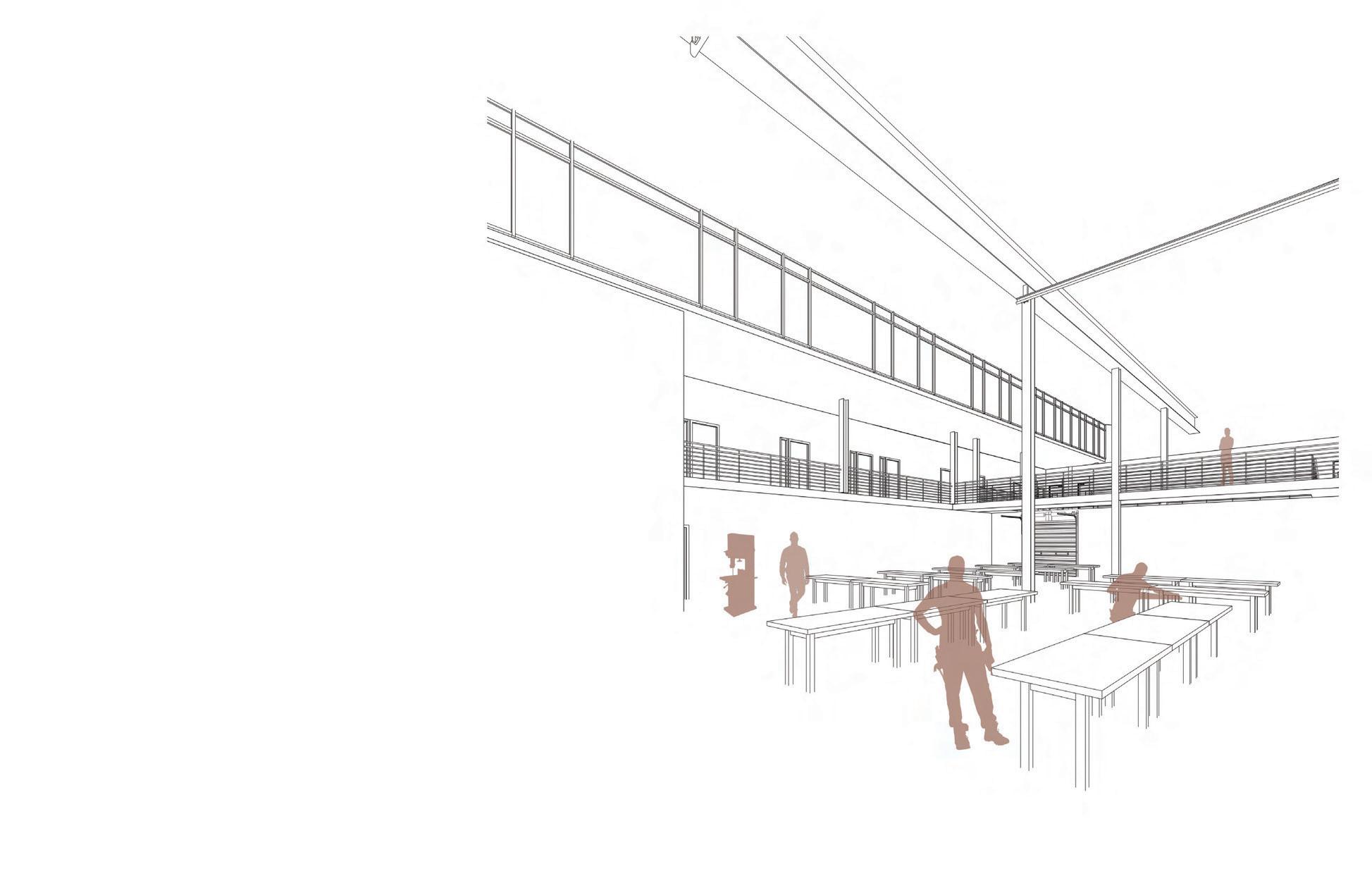 7Responding to community, site and infrastructure, the Poe Mill Community Resource Hub consists of a welcoming administrative and educational core with two large wings. The south wing houses the digital fabrication assembly floor, and the north wing houses office space, retail storefront, and a communal workshop space outfitted with machinery for wood, metal and digital design. In addition to sustainable strategies being implemented into the prefab panels being produced in the south wing, they are also implemented into the building itself to serve as precedent for measures Poe Mill can make to invest in energy efficiency and ultimately reduce consumption and costs over time.