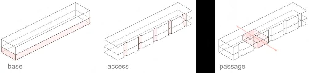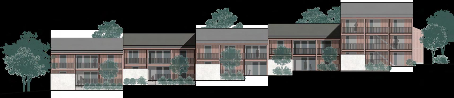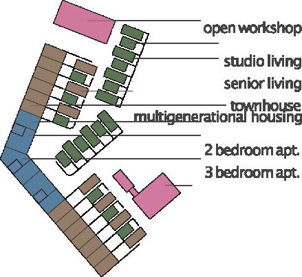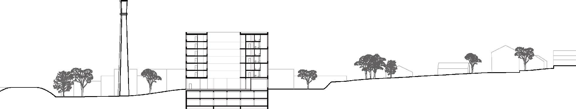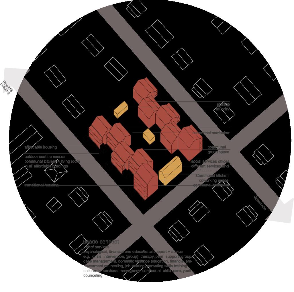 Theapproachistofillthesitewithabuildingthatreferencesthevolumeoftheformermill. Thismixed-usedevelopmentincludesapartmentsandmanyotherpublicfacilitiessuchas daycare,ayouthcenter,andseniorcare.Todensifythemillvillage,ahousingtypologyfor transitionalandaffordablehousing,aswellasoneformarket-ratehousing,fillsthesmaller plotswithinthevillage.