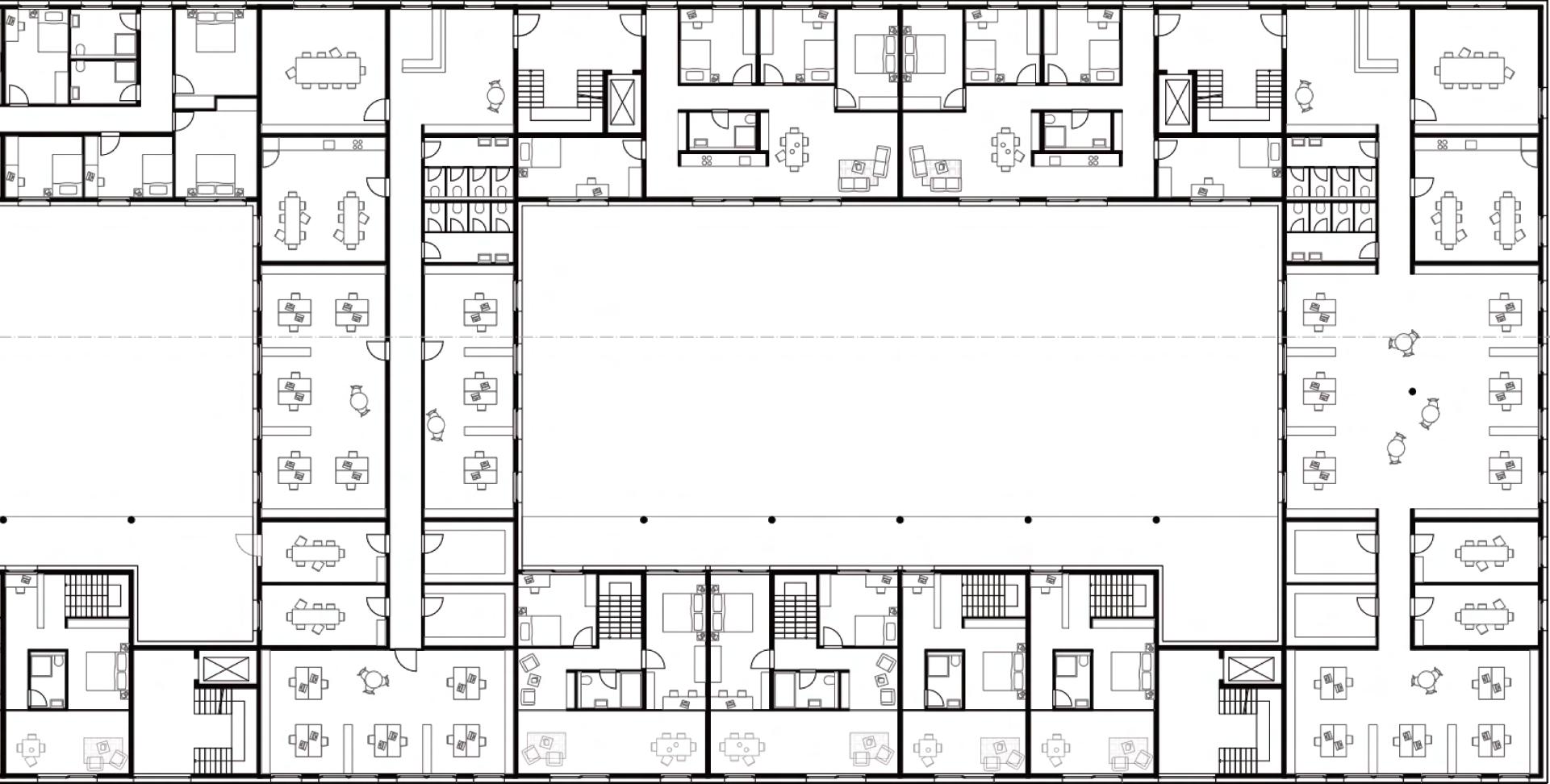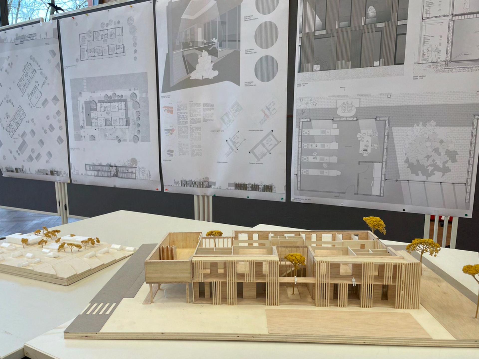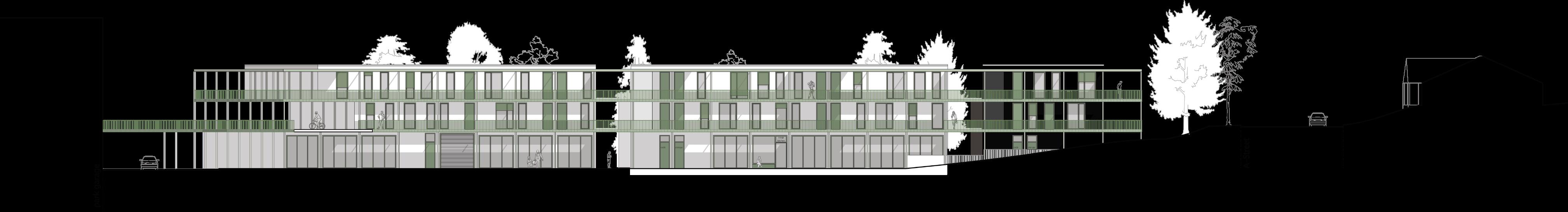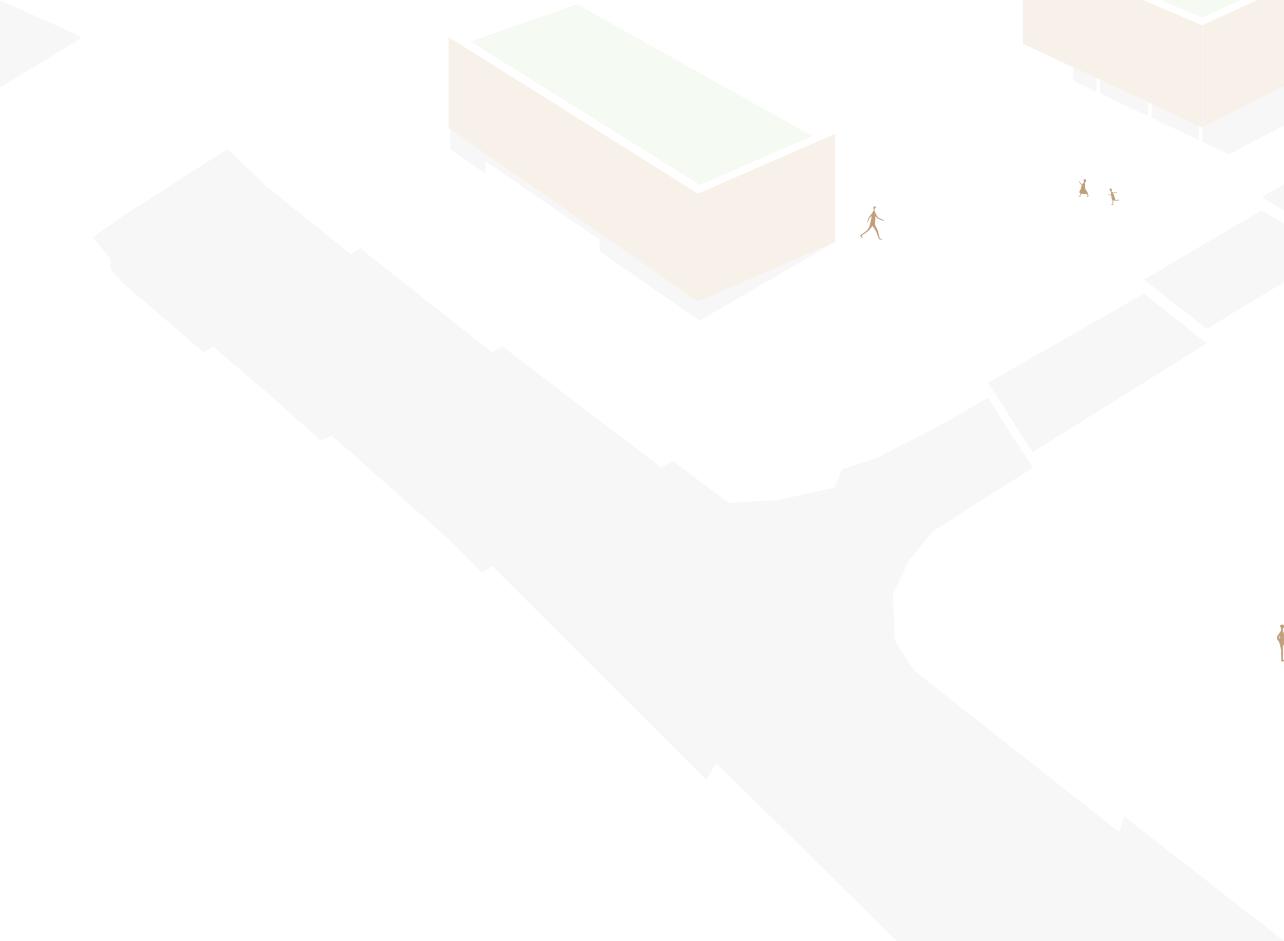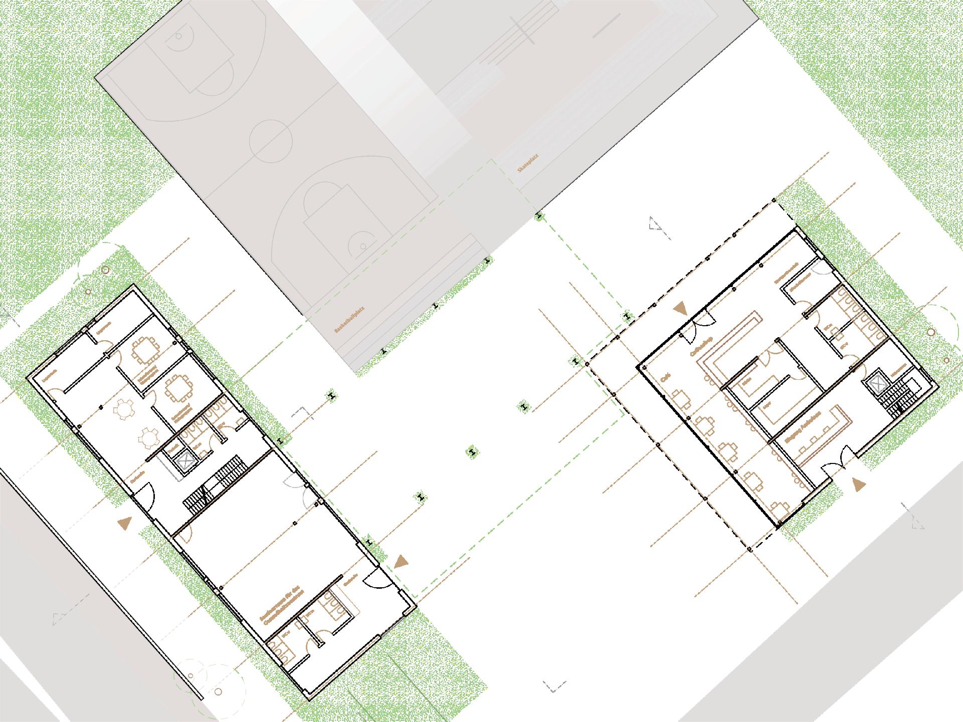 Inordertofitintothesurroundingneighborhoodof single-familyhomes,thefacilitiesaredividedinto severalbuildings.Thepositioningofthevolumescreates avarietyofpublicandsemi-publicspaceswith differentfunctions.Protectedbythebuildings,agreen oasisinthecenterofthebuildingswascreatedasa quietandsafeplace.Twoplazas,onelargeandone small,aresituatedatthesite'sedgesfacingthemain streets.Thelargerplazaconnectstotwoexisting churches.Theseplazasserveascommunitymeeting placesandfosterinteraction.Additionally,agreen corridoralongthesidewalksandturnoutsforvisitors weredesignedtoreinforceandreflectthemaster plan'spattern.