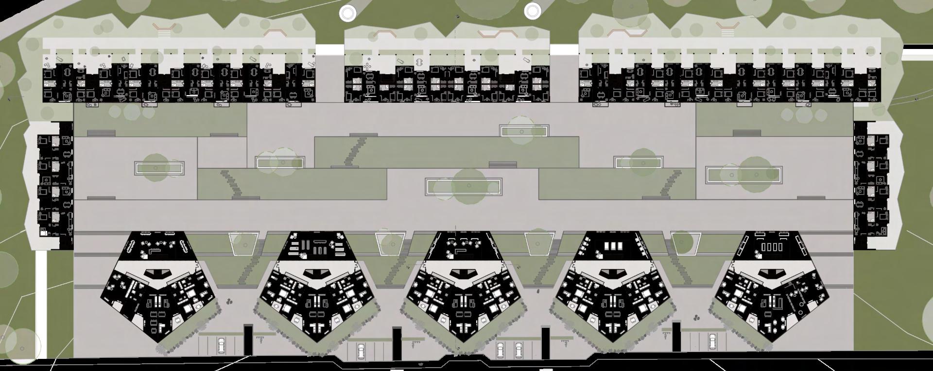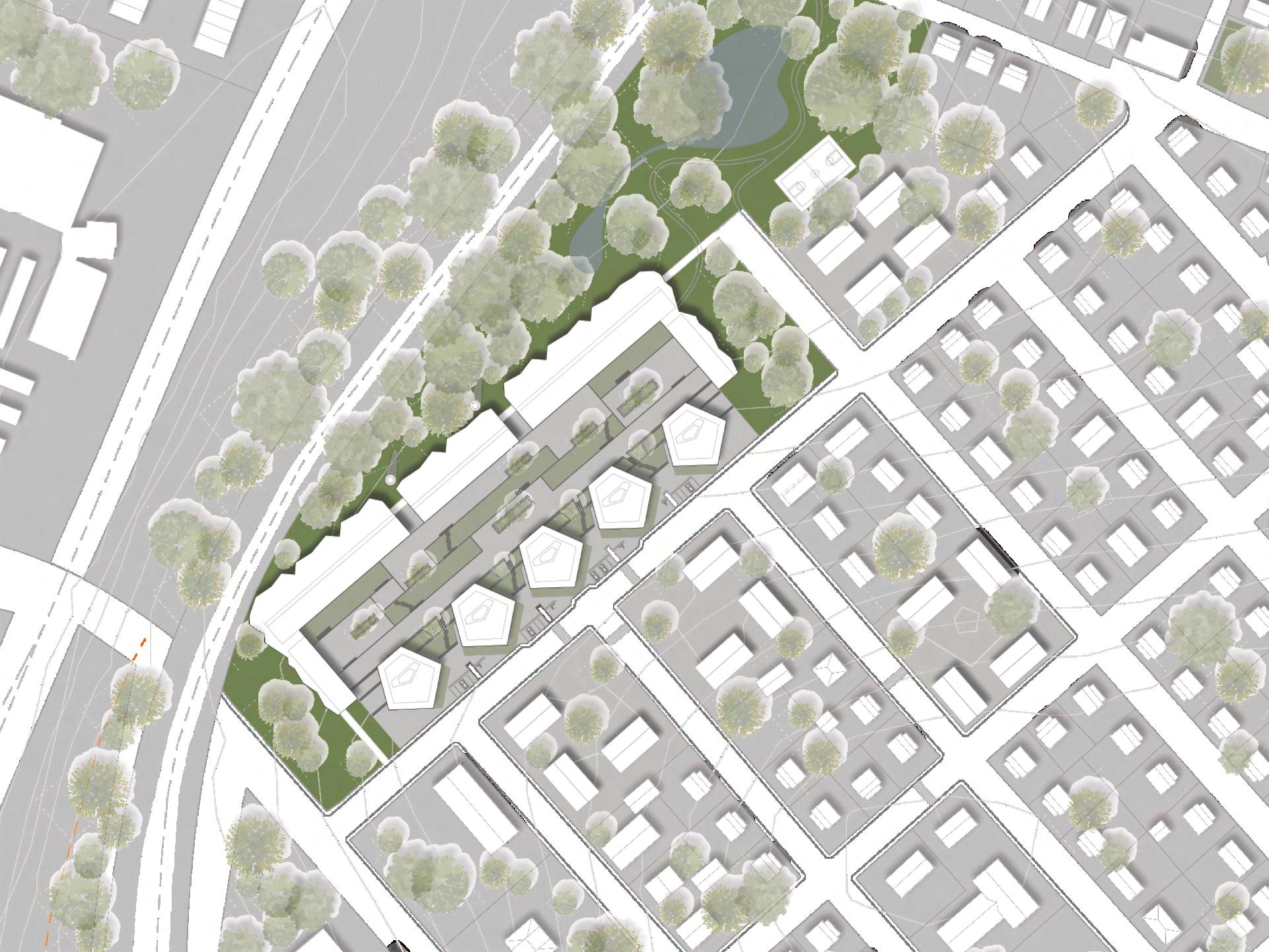 Theslantedfacades,positionedawayfromthepark,contributetoamoreopenandairy effect.Thishelpstopreventthebuildingsfromblendingintothefootprintofthepark,instead fosteringaharmoniouscoexistence.