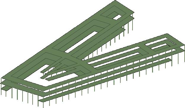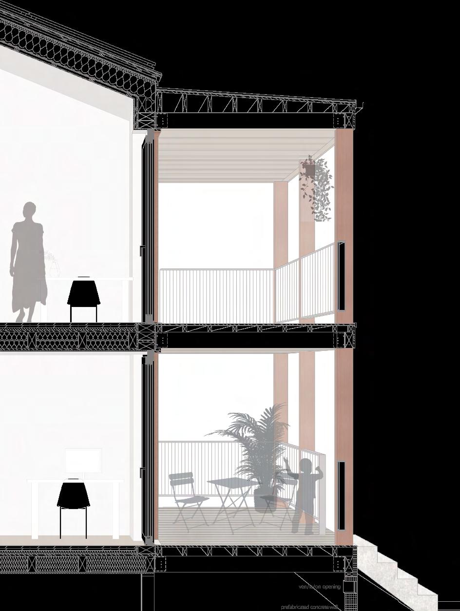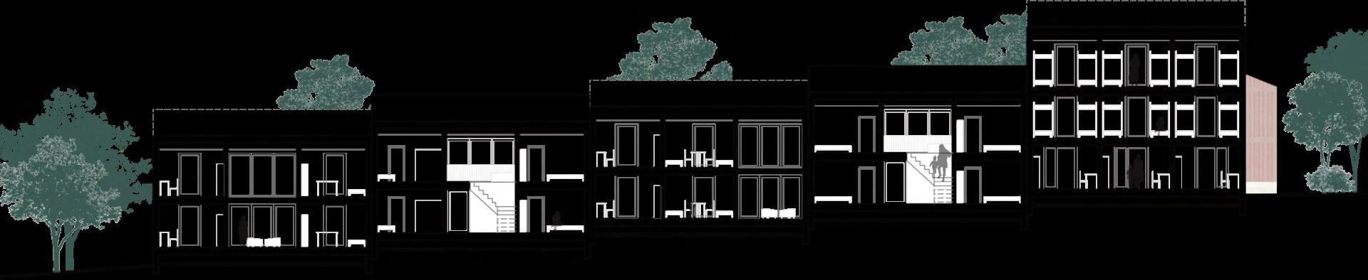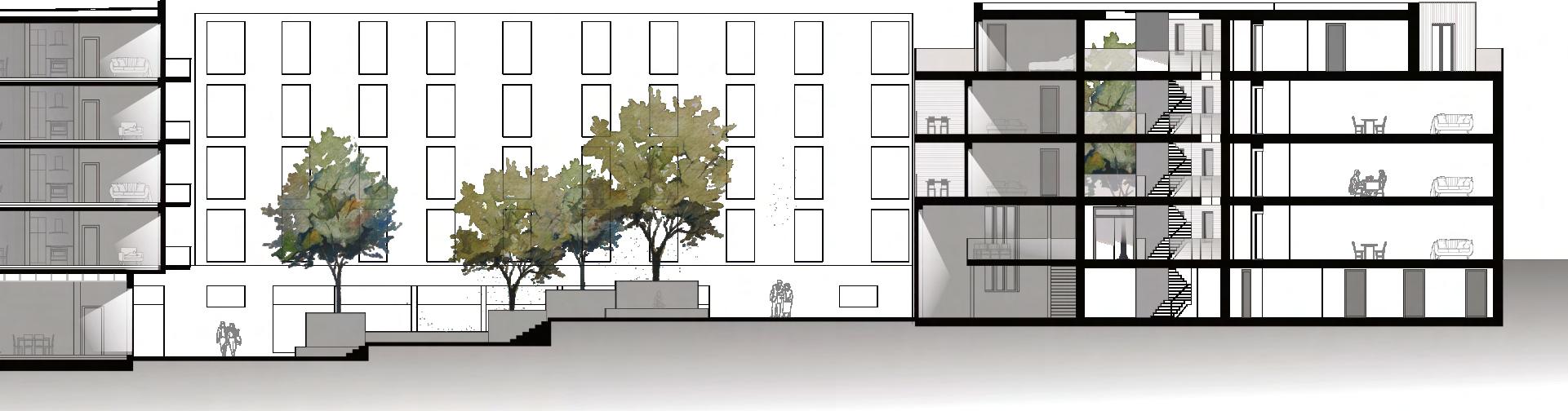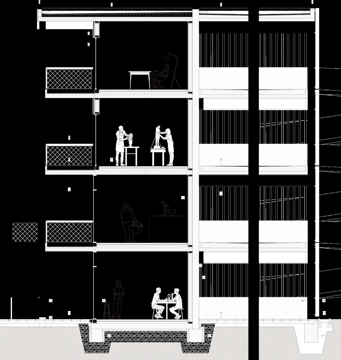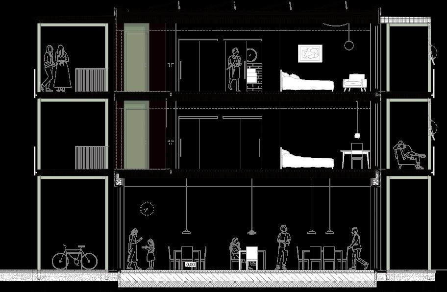 Theupperfloorsofthetwobuildingsareforresidential use,whilethegroundfloorcontainspublicfacilitiesand storageunits.Thereisalsoavisitorhostellocated directlyontheHighline,whichisanextensionofthe SwampRabbitTrail.Theresidentialunitsareaccessed viaanarcade.Onthefirstfloor,thereisalsoashelter forhomelesspeoplewhowillhavetheopportunityto moveintooneoftheapartmentsinthebuildingorlive inacommunityapartmentoncetheyhavemorestability intheirlives.Theideaisthatresidentsdonotalways havetomovetootherpartsoftown,butcanmove withinthebuildingastheireconomicsituationimproves. Therefore,socialhousing,workforcehousingand market-ratehousingwillbeoffered.Bothbuildings haveafloorareaofapproximately2500m2.Onthe upperfloorsthereare102apartments.Tenoftheseare sharedapartments.Theload-bearingstructureconsists oftimberbeamsandcolumns.Timberframewallsform theoutershell.Theinteriorwallsaremadeofcrosslaminatedtimberforthermalstorage,whilethefront arcadeandbalconyfeatureasteelstructurewith prefabricatedconcretewalkways.