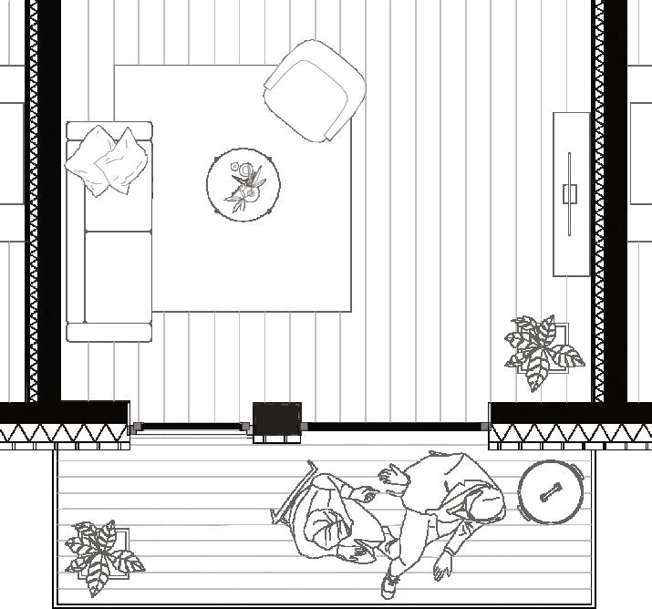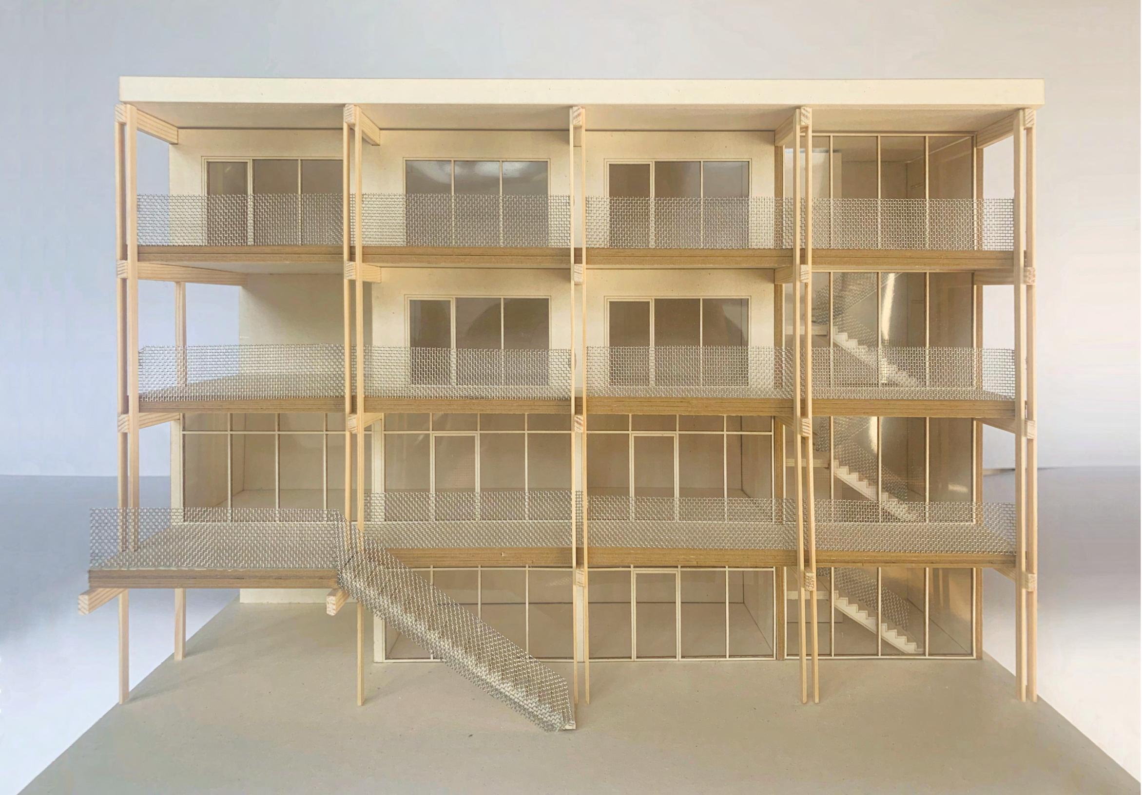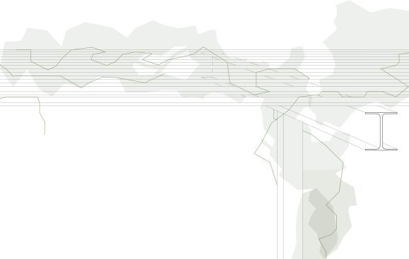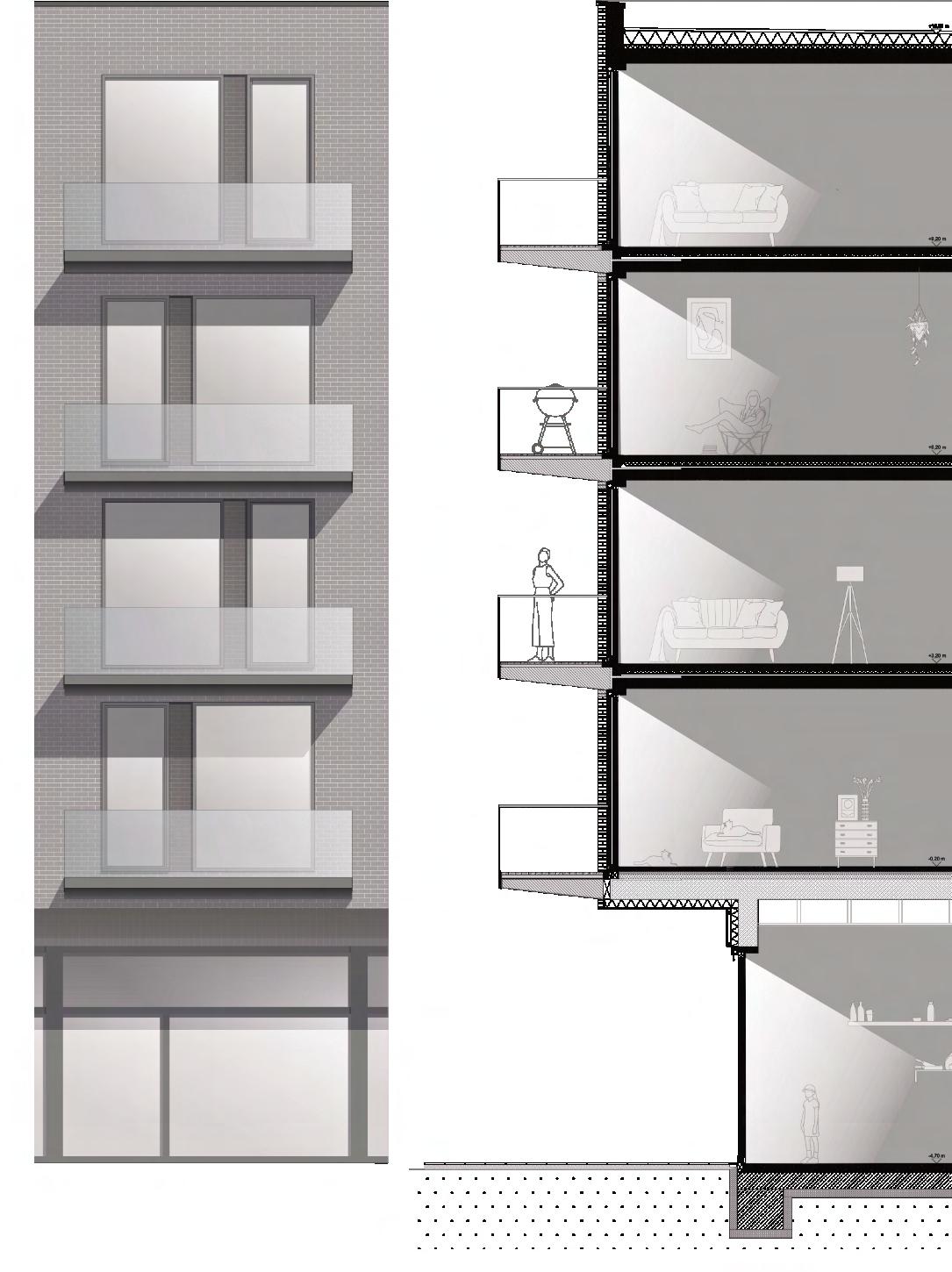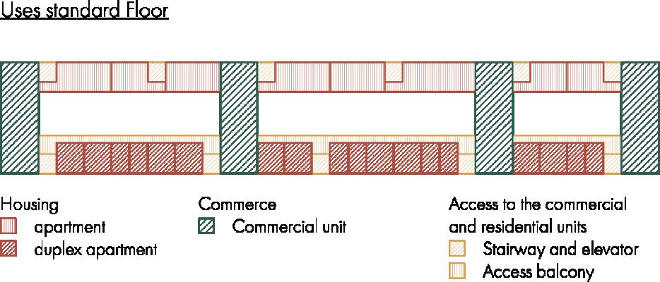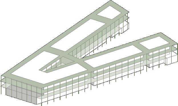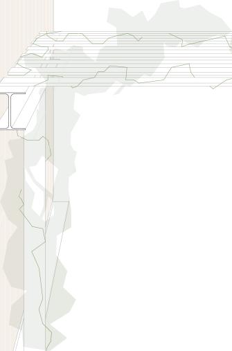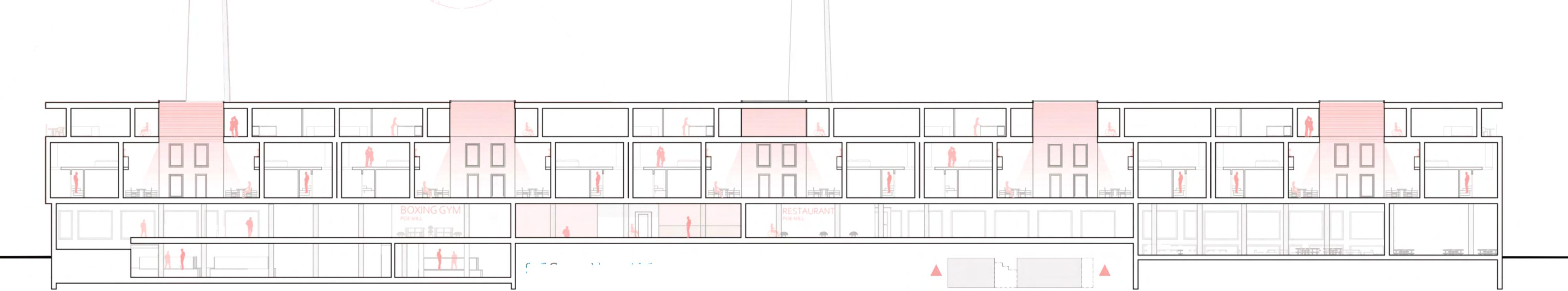 Theupperfloorsofthetwobuildingsareforresidential use,whilethegroundfloorcontainspublicfacilitiesand storageunits.Thereisalsoavisitorhostellocated directlyontheHighline,whichisanextensionofthe SwampRabbitTrail.Theresidentialunitsareaccessed viaanarcade.Onthefirstfloor,thereisalsoashelter forhomelesspeoplewhowillhavetheopportunityto moveintooneoftheapartmentsinthebuildingorlive inacommunityapartmentoncetheyhavemorestability intheirlives.Theideaisthatresidentsdonotalways havetomovetootherpartsoftown,butcanmove withinthebuildingastheireconomicsituationimproves. Therefore,socialhousing,workforcehousingand market-ratehousingwillbeoffered.Bothbuildings haveafloorareaofapproximately2500m2.Onthe upperfloorsthereare102apartments.Tenoftheseare sharedapartments.Theload-bearingstructureconsists oftimberbeamsandcolumns.Timberframewallsform theoutershell.Theinteriorwallsaremadeofcrosslaminatedtimberforthermalstorage,whilethefront arcadeandbalconyfeatureasteelstructurewith prefabricatedconcretewalkways.