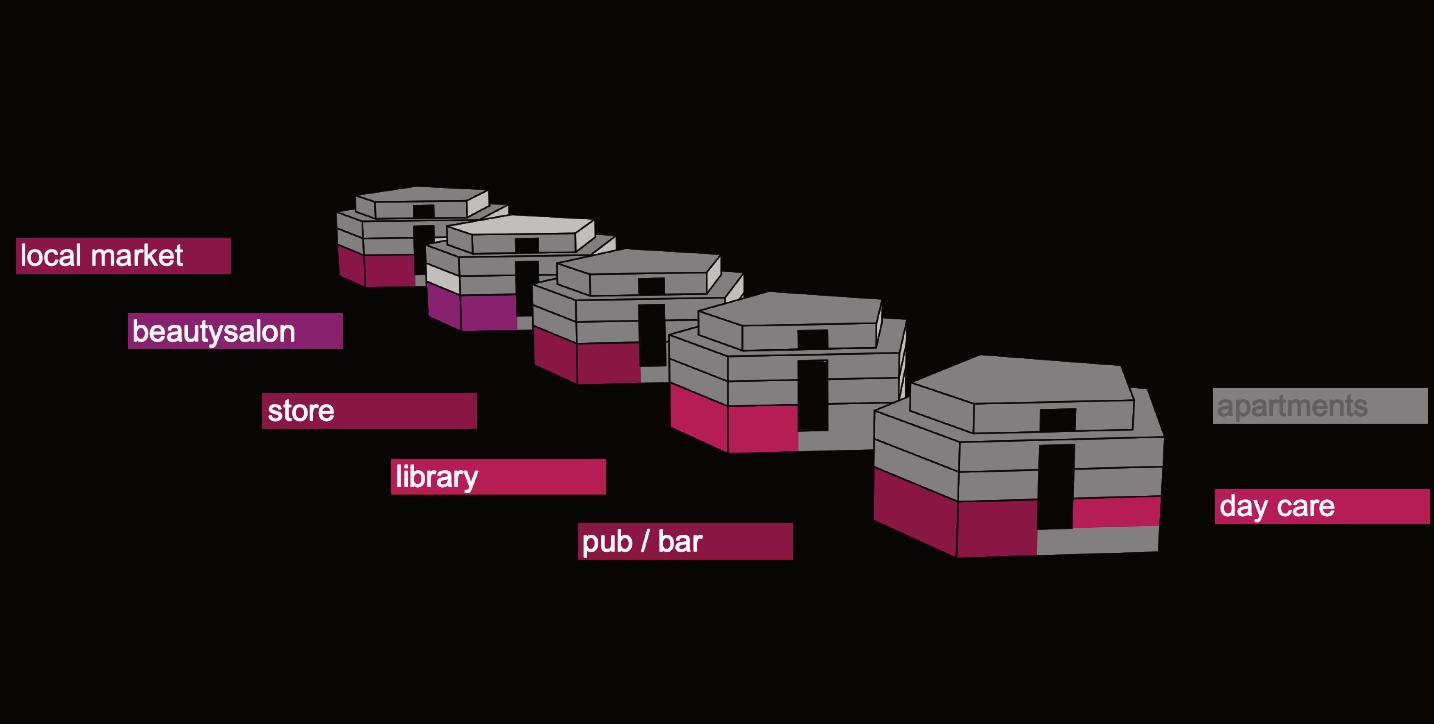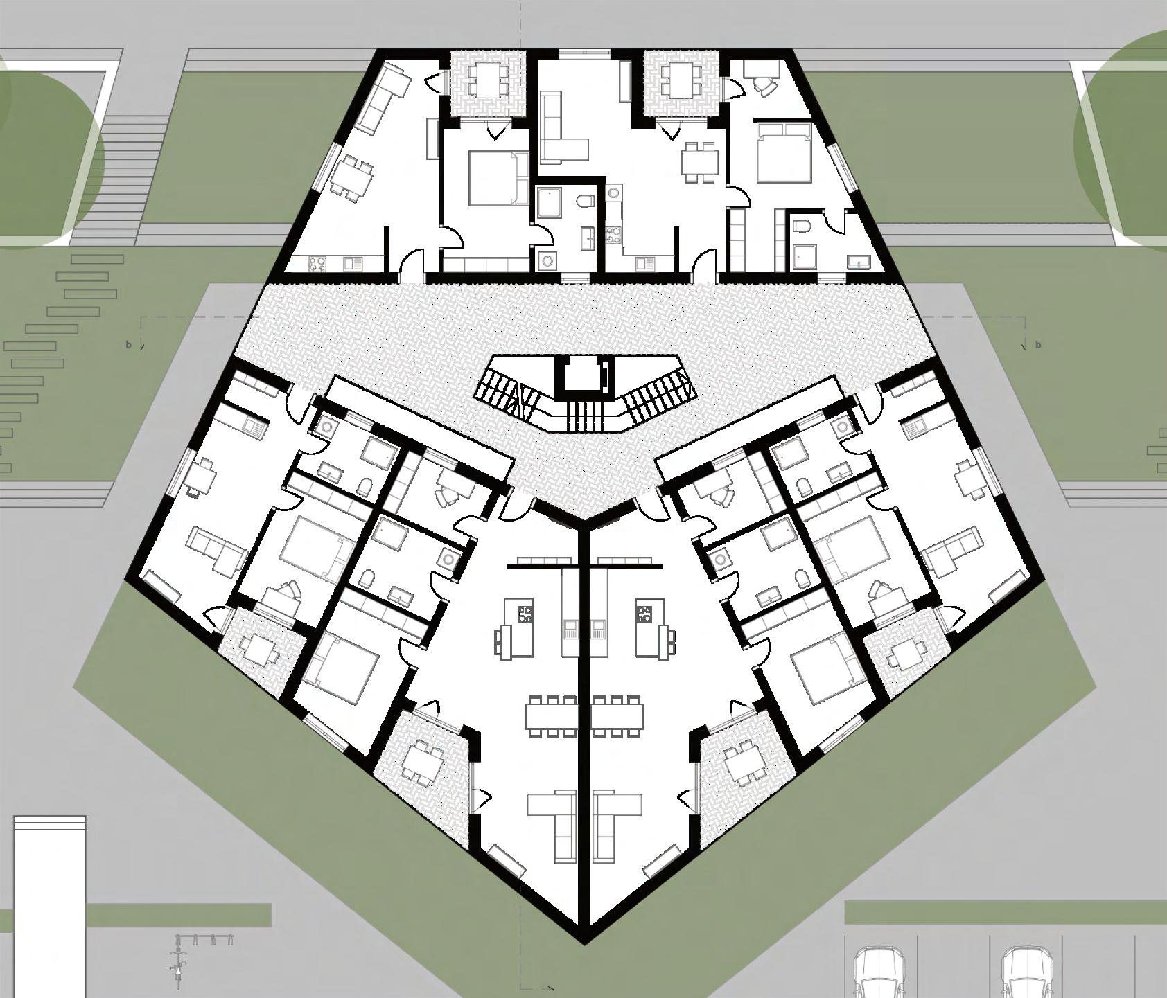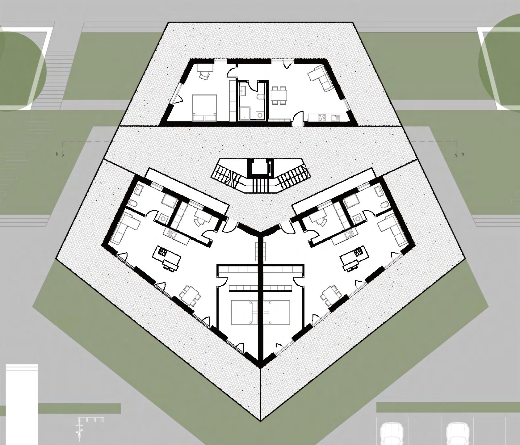Thefivepentagonsarecarefullyintegratedintothe naturalreliefoftheslopingterrainwithstairs,green areasandplantedpassages.Thescaleoftheparkis reminiscentofthescaleandstructureoftheoldmill building.Thewoodfacadeechoestheverticalstructure ofthehistoricfacade,andwoodfoldingshutters providevariety,privacyandshade.Eachsideofthe buildinginvitesinteraction.Thestairwellisdesignedto beveryopentotheoutsideandincludesskylightsto bringnaturallightintothebuilding.Inaddition,itis possibletolookthroughallfivepentagonsasyouwalk throughthebuilding.Onthestreetside,thepentagon extendsoverthreefloorsandthepenthouse,whileon theparksideitextendsoverfourfloorsandthe penthouse.Thegroundfloor,whichisonlyaccessible fromtheoutside,housesvariouscommunityusessuch asapub,alibrary,aclothingstore,abeautysalon, andalocalmarket.Thegroundfloorfacingthestreetis primarilyresidential,withexceptionsforabistroanda daycarecenter.Eachpentagonhas19or17 apartments,allwithaloggiaandthepenthouses witharoofterrace.