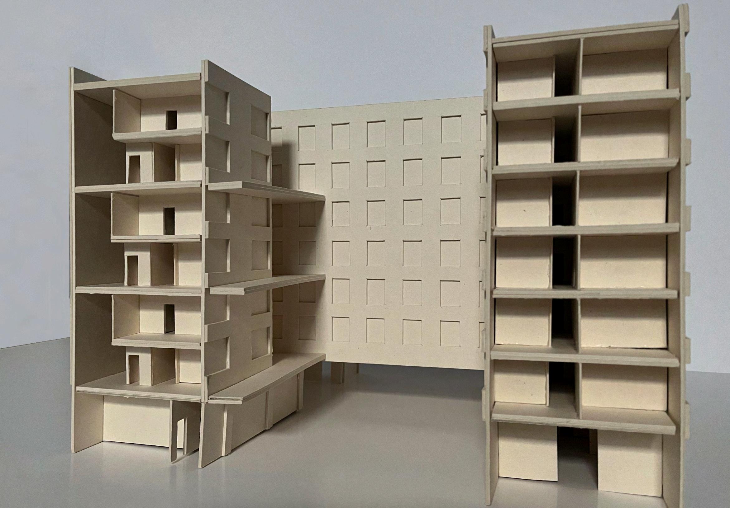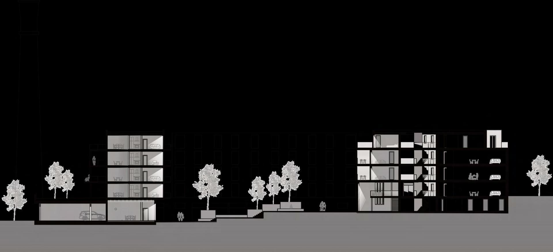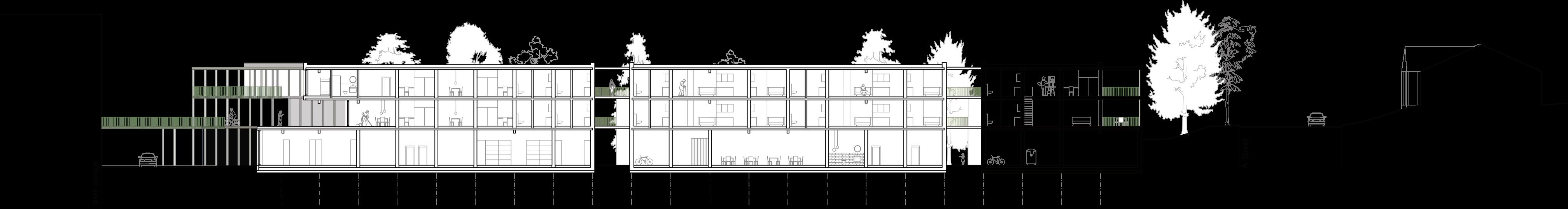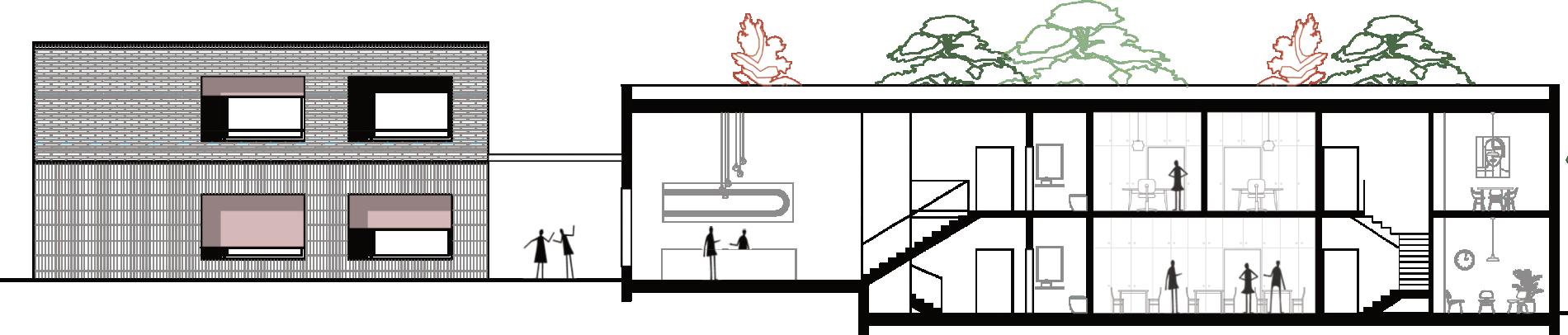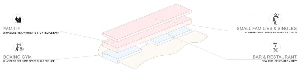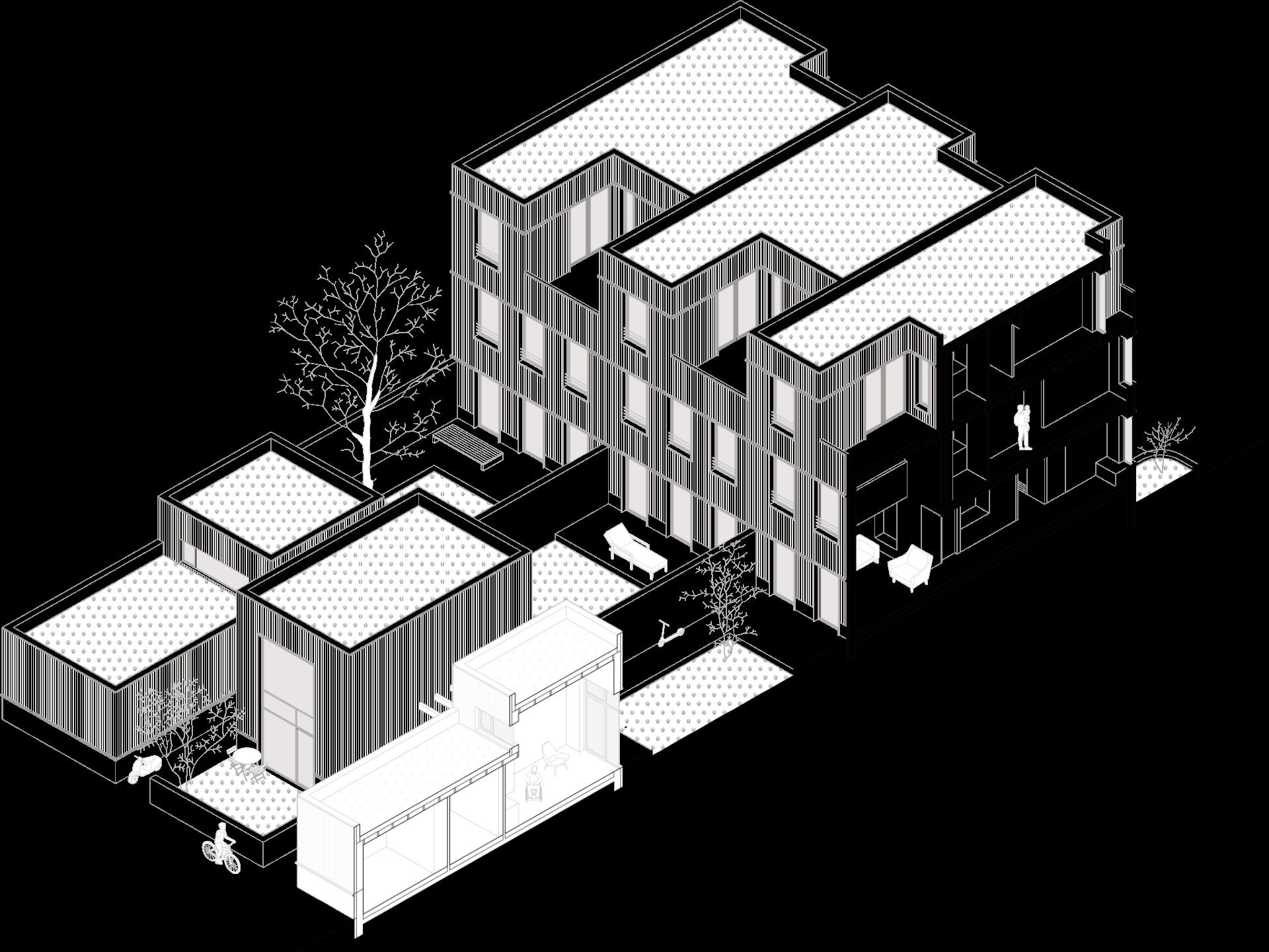 ThebuildingcomplexisdesignedinaU-shapeto achieveasoundbarrierforthecourtyard.Itconsistsof 5buildingsectionswith116apartments,10public facilitiesandagaragebehindthem.Thegroundfloor housespublicamenitiessuchasagym,grocerystore, healthfacilities,daycare,andalargekitchenopento thepublic.Behindthepublicfacilitiesisaparking garagewithasemi-openreardesignedtointegrate withthesurroundings.