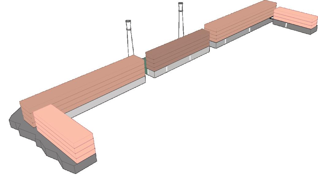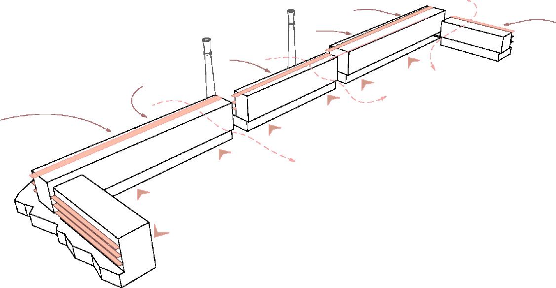 Theopen-airstage,embeddedintherailroadembankment,leadstothetwofreestanding chimneys.Here,themainplazasformaroundandthroughthesturdybuildings.