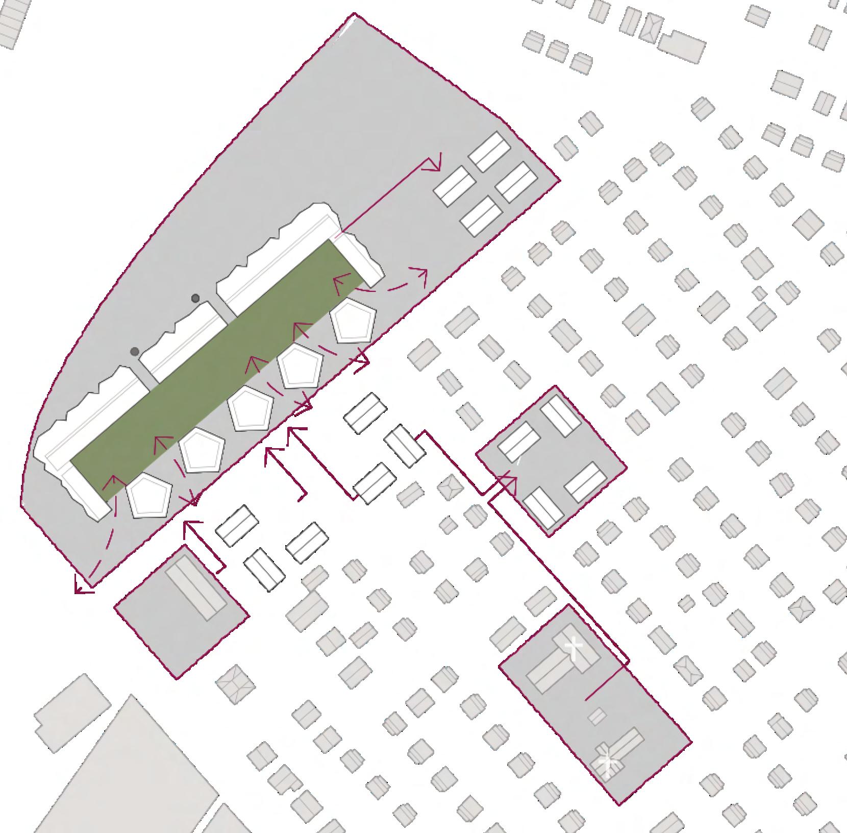 Theconnectionsaredesignedtobeaccessibletoall.Paths,publicfacilitiesandbuilding volumesskillfullymediatebetweenexistingandnewcenters.