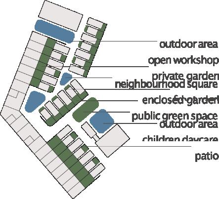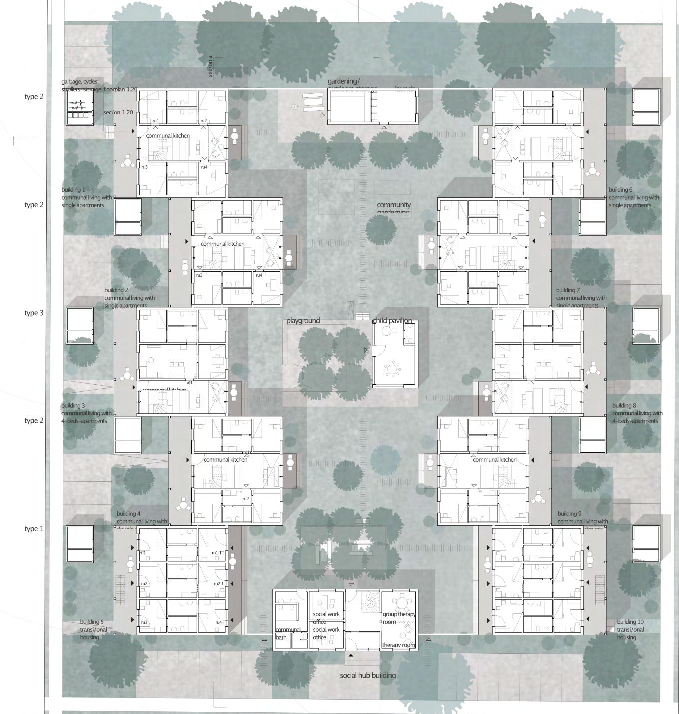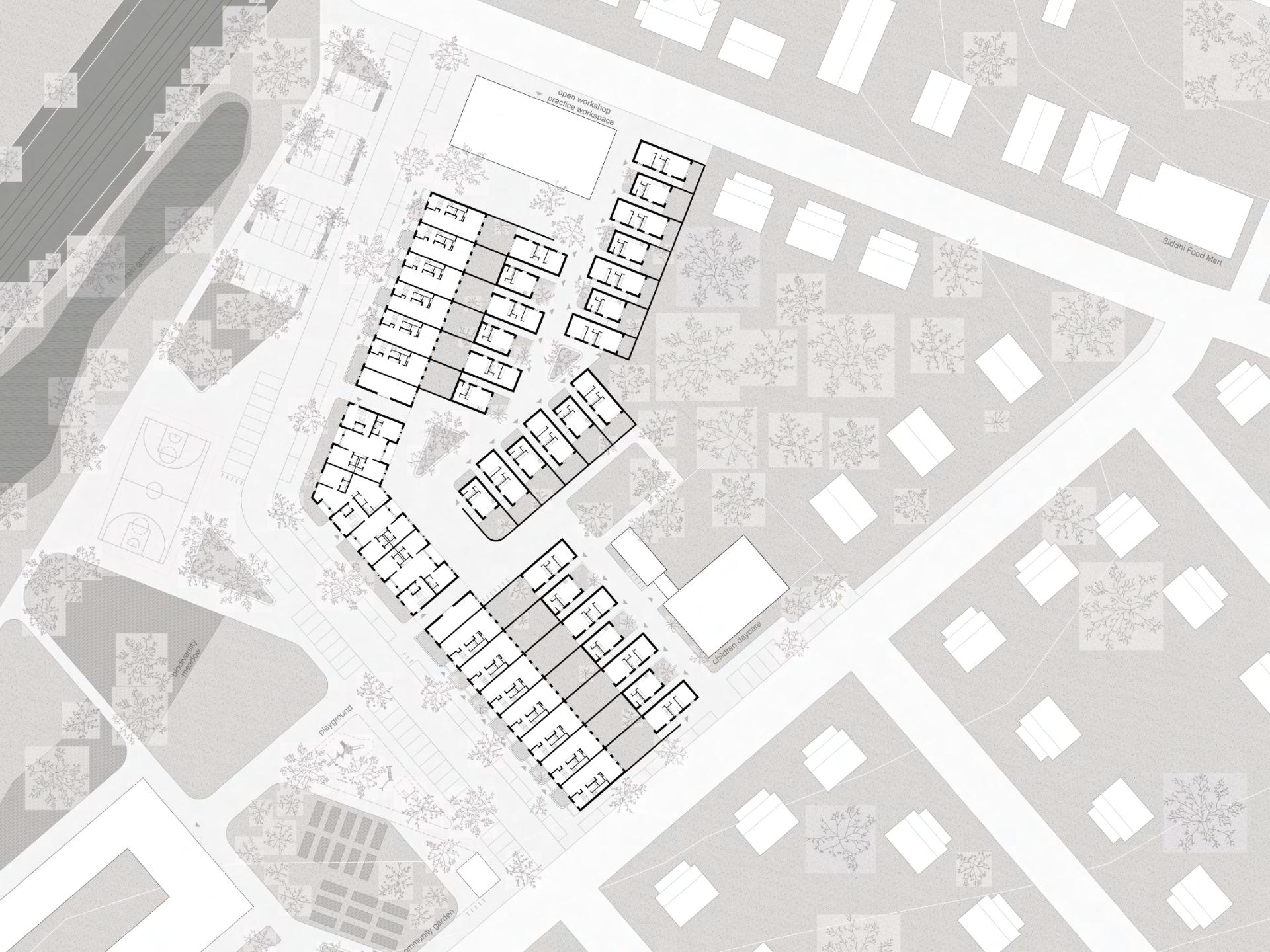 Takingadvantageofashiftedtownhousestructure whichoffersdifferentscalesofdensification,thisproject addressesthehousingneedsofspecificdemographic groupswithinthesocialstructureoftheneighborhood whorelyonaffordableoremergencyhousing.By creatingamixofhousingtypes,relocationwithinthe neighborhoodisgivenpriorityovermovingtoother partsoftown.Inthisway,residentscanmovewithinthe neighborhoodastheirincomesorrentschange,without losingtheirfamiliarsurroundings. Awomen'sshelterwillbebuiltonthesiteforsingle women,singlemothers,youngandminorwomen,and theirchildrenwhoneedspecialsecurityandsupport duetobackgroundsofdomesticviolenceorsimilar situations.Thelayoutofhousesandoutdoorspaceswill providehighprivacyandseclusion. Theselectedsiteaccommodatestworowsofhouses withacentralcourtyard,offeringaprotectiveliving environment.Itsproximitytotheneighborhoodcenter ensureseasyintegration,accesstopublicfacilities,and greenspaces,fosteringadiversecommunity.