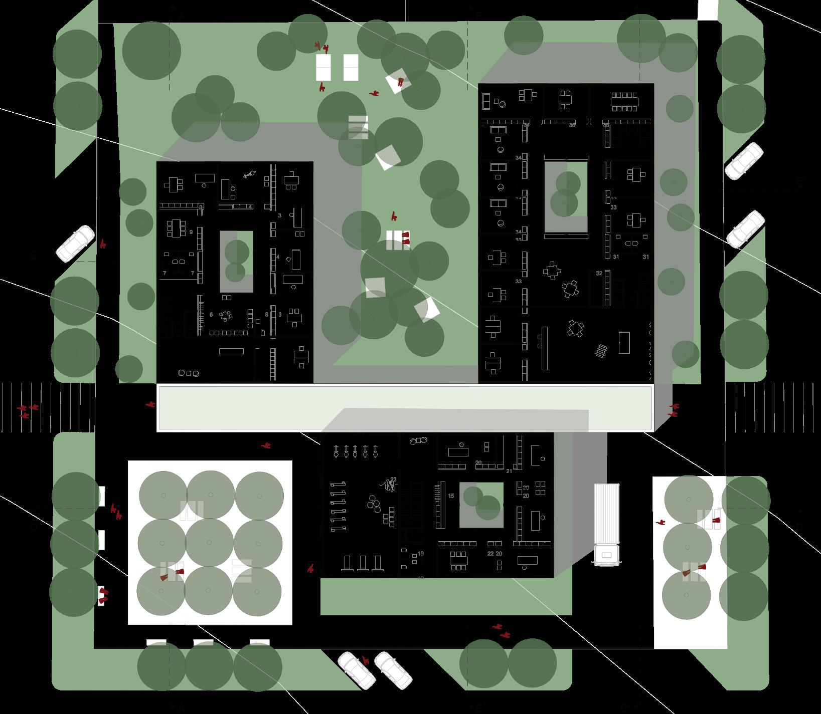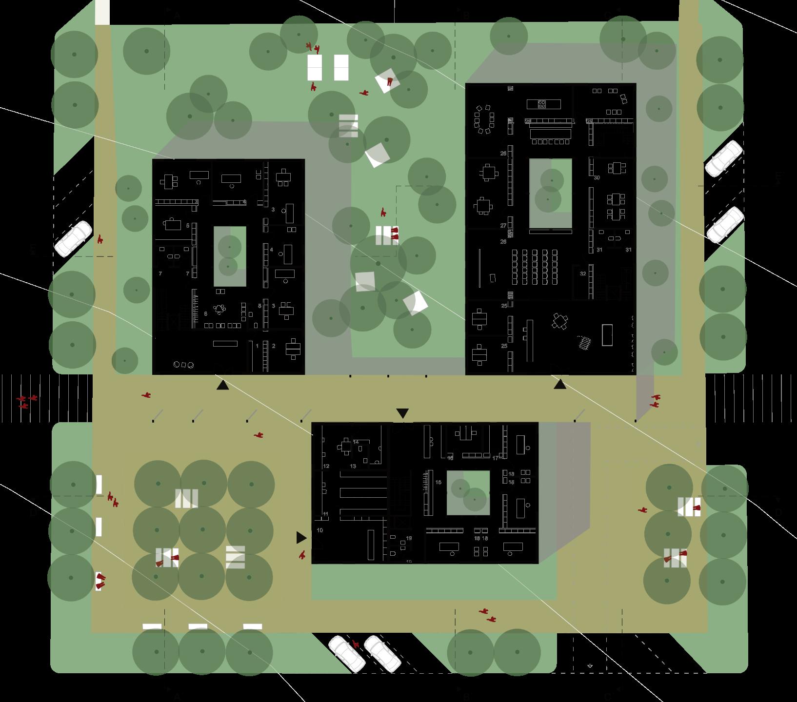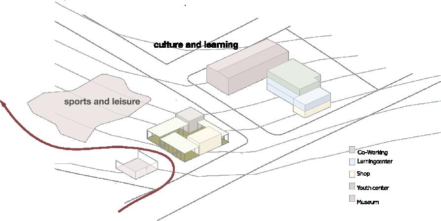 Bypositioningthenewbuildingsinconjunctionwiththe existingmuseumbuilding,multi-functionalplazasare created.Thesespacesoneithersideofthestreetare cleverlydesignedtomergeintoonelargeplaza.Along theleftsideisapavilionthathousesaskateshopanda youthcenterthatconnectstotheadjacentsportscenter. Thepavilionisaccessiblefromalldirections,further enhancingtheinteractionbetweenthetwobuildings. Oppositeisthelargerofthetwonewbuildings,the CommunityCenter.Spreadover3floors,ithousesa learningcenter,seminarrooms,asmalllibrary,andcoworkingspaces.Themoststrikingfeatureofthisbuilding istheinterconnectedatriumthatspansallfloorsand facestheplaza,bringingthebuildingtolifefromwithin. Masterplan1