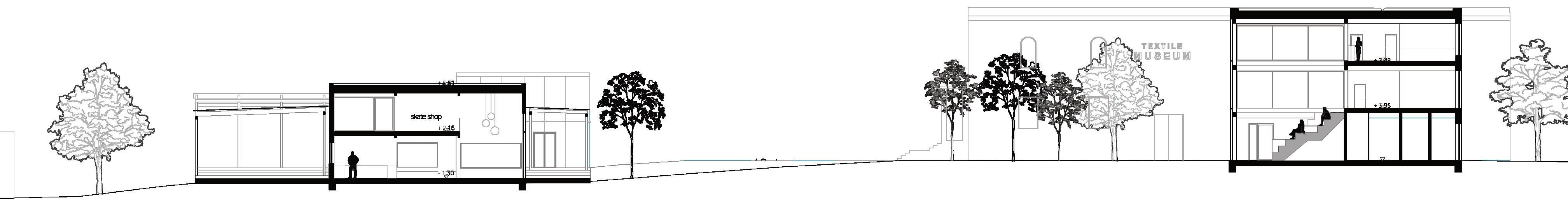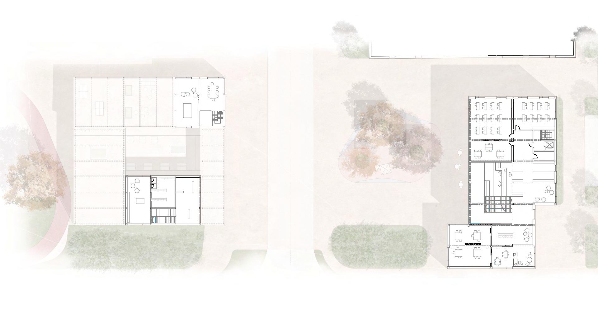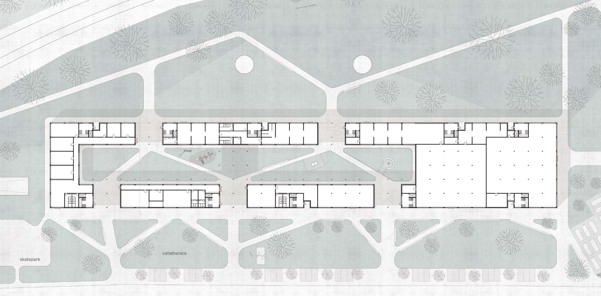 Bypositioningthenewbuildingsinconjunctionwiththe existingmuseumbuilding,multi-functionalplazasare created.Thesespacesoneithersideofthestreetare cleverlydesignedtomergeintoonelargeplaza.Along theleftsideisapavilionthathousesaskateshopanda youthcenterthatconnectstotheadjacentsportscenter. Thepavilionisaccessiblefromalldirections,further enhancingtheinteractionbetweenthetwobuildings. Oppositeisthelargerofthetwonewbuildings,the CommunityCenter.Spreadover3floors,ithousesa learningcenter,seminarrooms,asmalllibrary,andcoworkingspaces.Themoststrikingfeatureofthisbuilding istheinterconnectedatriumthatspansallfloorsand facestheplaza,bringingthebuildingtolifefromwithin. Masterplan1