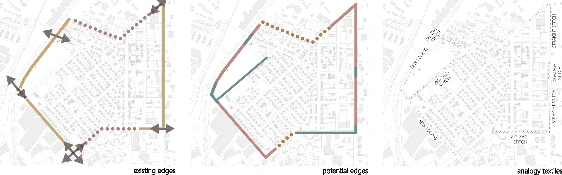 Withthestrategyof'unravelingandentanglingtheseams',theformerPoeMillsiteandits MillVillageweredevelopedfromtheoutsidein.Inafirststep,theedgeswereanalyzed lookingatdifferentfeaturessuchasstreets,buildings,greenspaces,oruses.Theexisting edgeswerethenevaluatedandclassifiedassoftorhardedges:Hardedgesarefor exampleroads,therailwaylineoranindustrialarea.Residentialareascanbesoftedges.