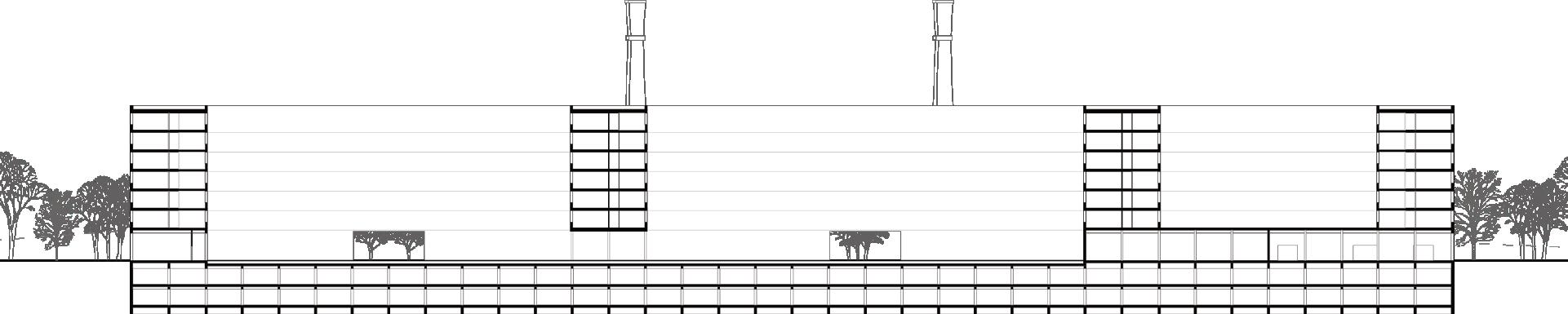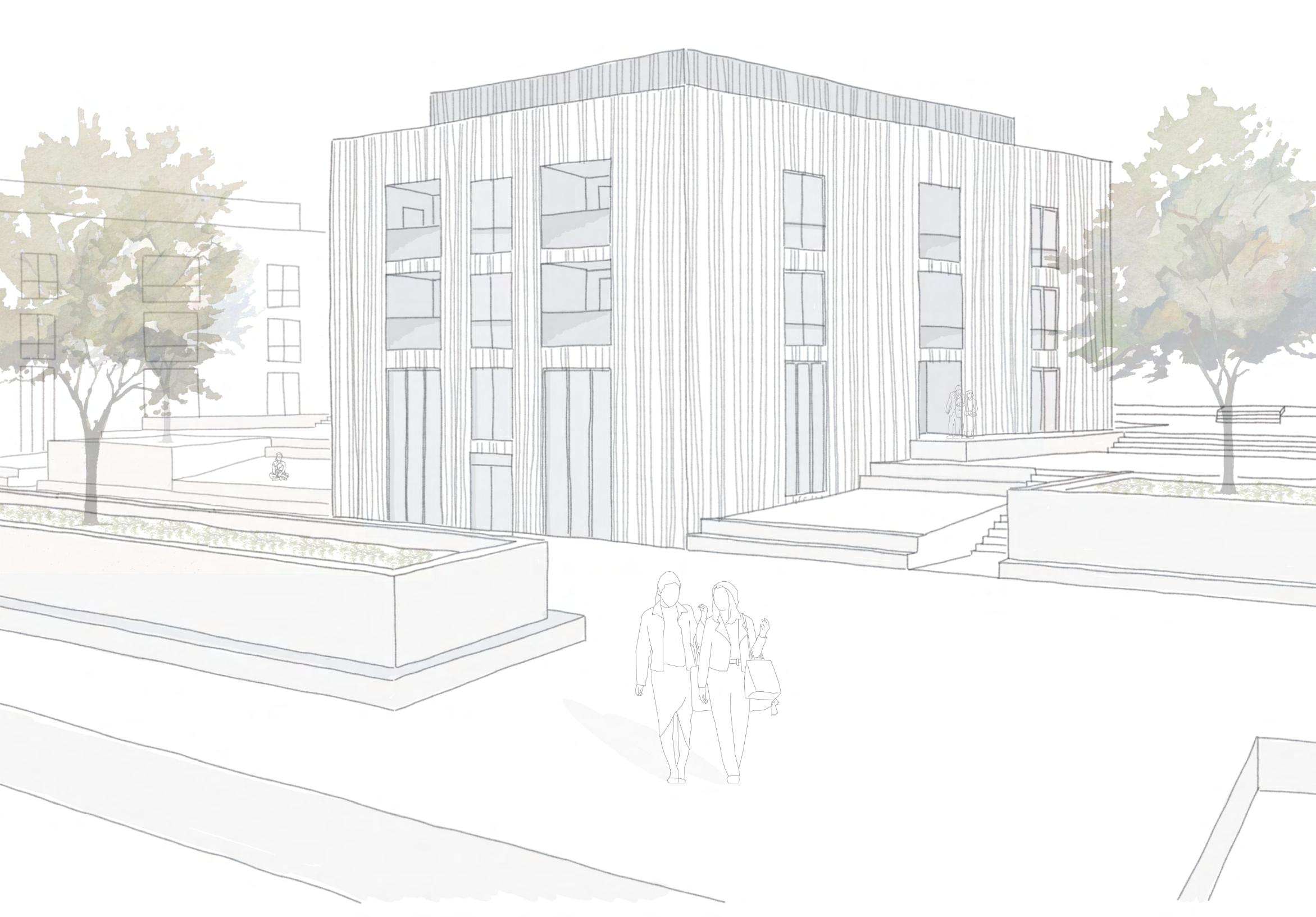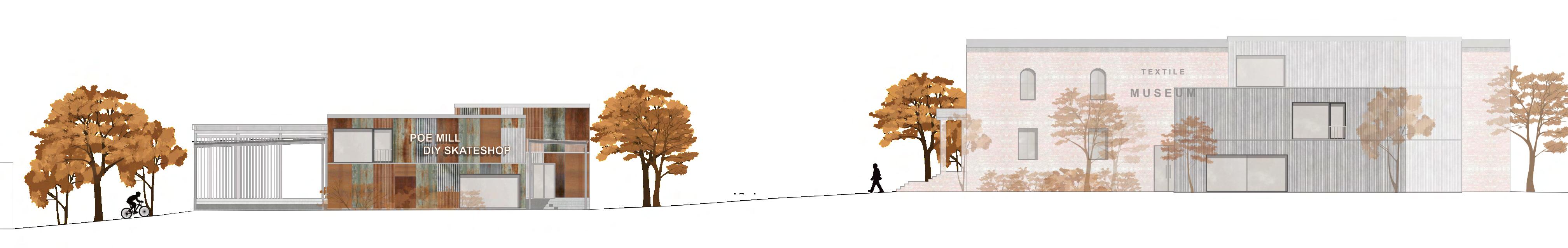 Theproposedculturalandsocialcenterconsistsoftwo newbuildingsandtheexistingPoeMillofficebuilding, whichwillbeconvertedintoatextilemuseum.Together, theyformanarchitecturaltriadthatprovidesanew gatewaytothePoeMillneighborhood.