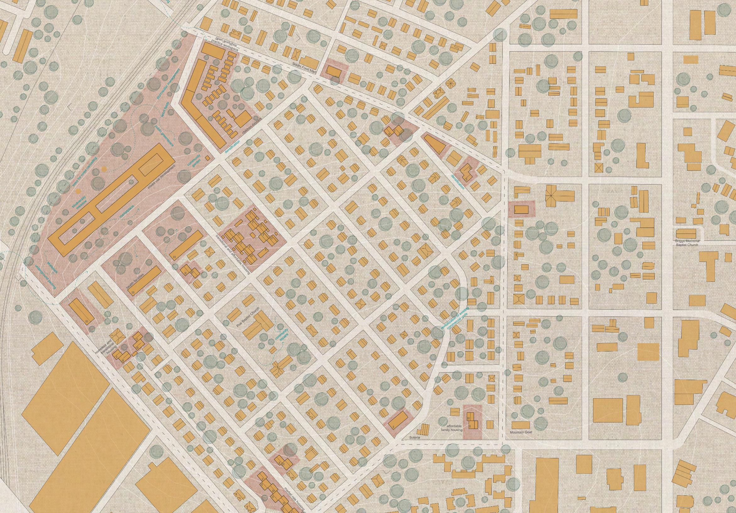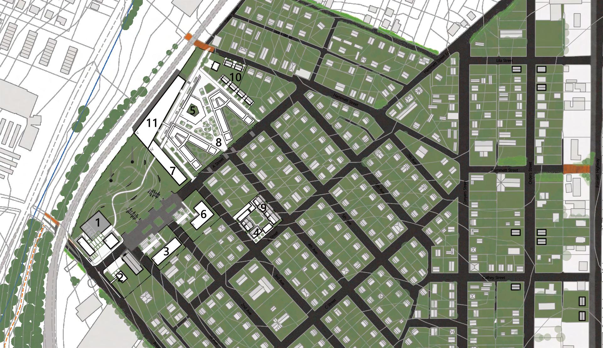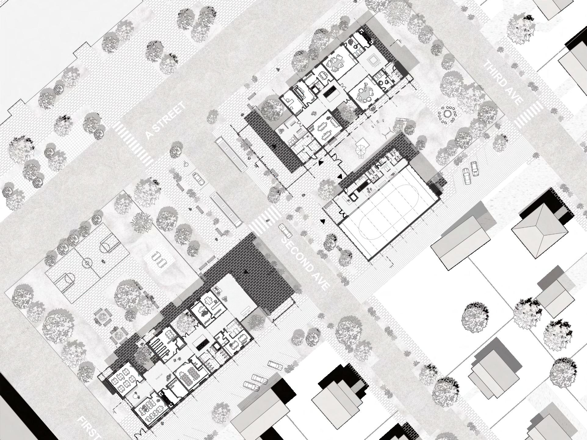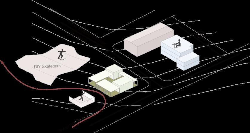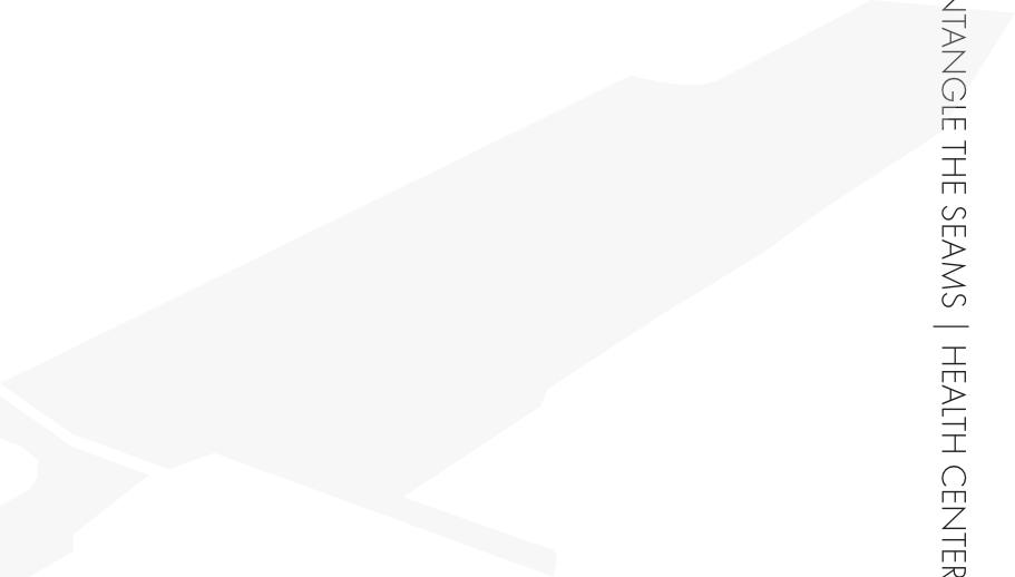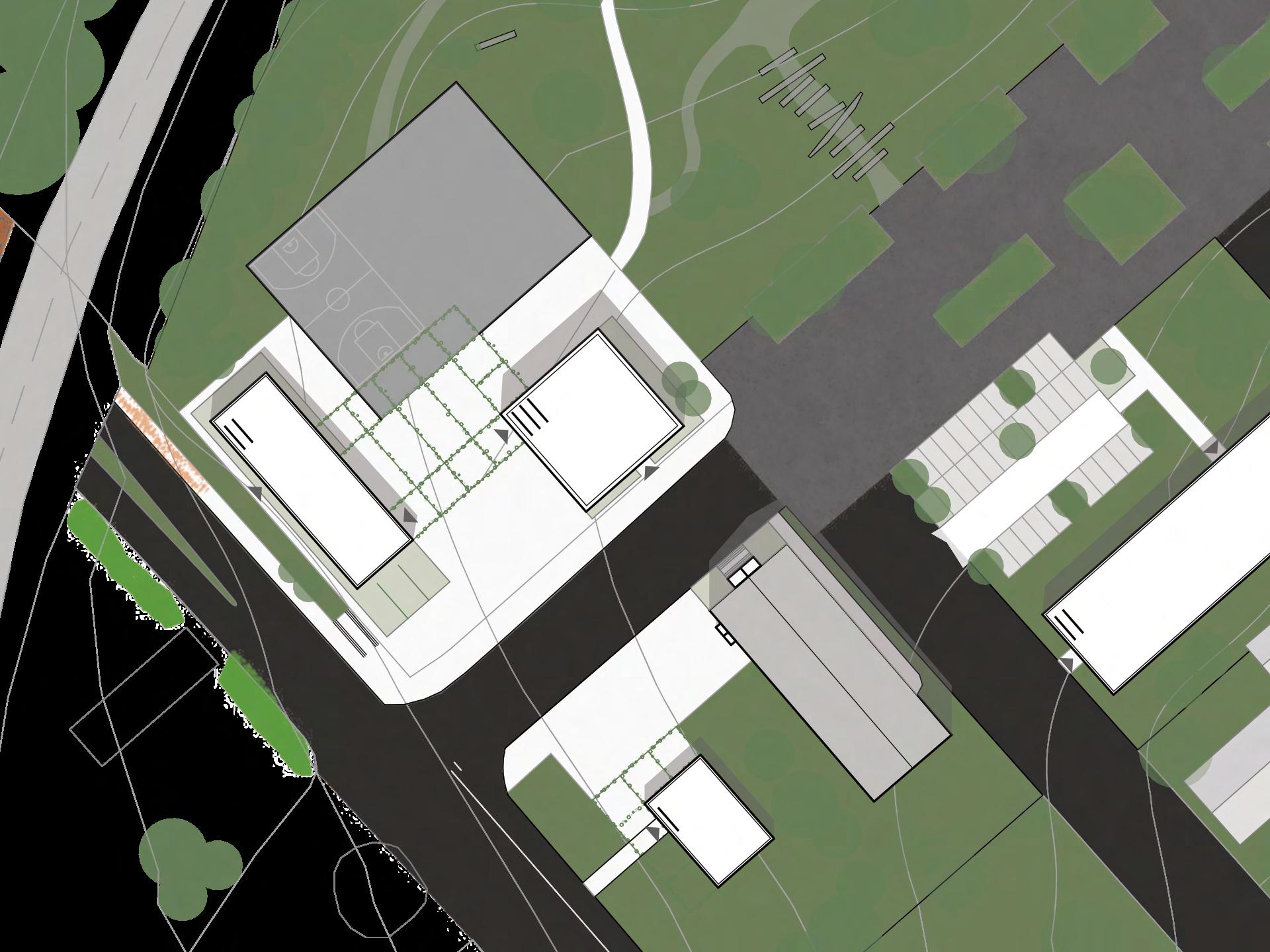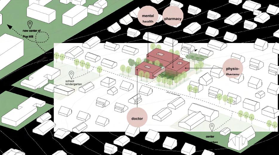 Thehealthcenterforphysicalandmentalhealthatthe southwesternedgeofthedistrictwillbedeveloped fromtheedgesasoutlinedinthemasterplan.A gatewayiscreatedbythehistoricmillofficebuilding andanewbuildingtospatiallyshapetheentrance squareandseparateitfromthelargemarketsquare. Thedesignprovidesabacktotherailroadtoshieldit, andtherhythmoftheexistingresidentialbuildingsis completedwithafinalunit.Thehealthcenteraimsto lowerthethresholdforresidentswithmentalhealth issuesbymaintainingacertainlevelofanonymity.It consistsofseveralbuildingsconnectedbyagreenroof. AlongbuildingalongBuncombeRoadhousesrooms forsupportgroups,seminarsandexerciseclasses.On theothersideisasquarebuildingwithacafé for athletesonthegroundfloorwhichconnectstothe outdoorsportsareasandtwofloorsabovefora mentalhealthclinic.Asportsfieldandskatepark completethecomplex.Thegreenroofcreatesvarious connectionstothebuildingsandprovidescovered areas,suchasbleachersforthebasketballcourt.