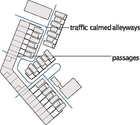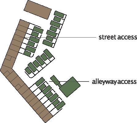 PoeMillGardensisanewneighborhoodintheformer millvillage.Thegoalistocreateamixofhousingtypes intheneighborhood.Inadditiontosmallstudios,there arebungalowsdesignedtobeaccessibleandage appropriate,apartmentsofvarioussizes,townhouses andmulti-generationalhousesintheformofoutsourced retirementapartments,whicharewidespreadinCentral Europe.Theneighborhoodischaracterizedbyvarious formsofenclosedgardens,greenspaces,alleysand publicmeetingplaces.Thereisadirectconnection betweentheapartmentandthegarden.Theentire districtisaccessiblefromtwomaindirections.The townhousesandapartmentsareaccessedfromthe street.Thesmallerresidentialunitsonthesecondlevel areaccessedviaalleys,whicharecar-freeintheir structure,butcanalsobeusedbythenecessaryservice providersanddeliveryvehicles.Twoalleysconnect directlytothestreetsoftheexistingneighborhood.Two otherpassagesunderthemulti-storybuildingalso provideaccessfromthenewstreettothesecondlevel ofhouses.