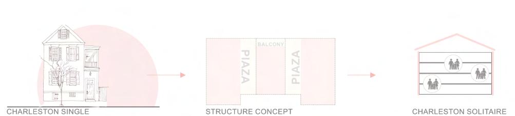 TheCharlestonSingleisahousetypologywhich representsasuccessfulsymbiosisbetweenmodern residentialconstructionandtheuniqueurbanstructure ofCharleston.Inthisproject,itisusedasareference foralarge-scaleresidentialbuilding.Thescaleofthe buildingblendsharmoniouslywiththearrangementof themodulesthatformtheheartofthisinnovative residentialconcept.