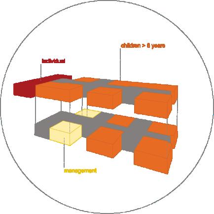 Thelayoutoftheelementaryschoolmirrorsthatofthe daycare,followingtheMunichStudyhousesystemwith twoclassespergradefromonetofour,foratotalof eightclasses.