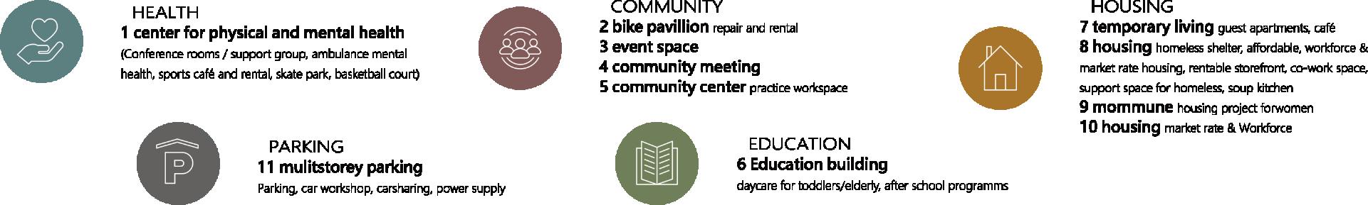 Theinitialideabehindthisprojectwastocreateacrisis centerprovidingmentalhealthservicesandemotional supporttothelocalcommunity.SincePeopleinneedof helpmaybeashamedtoaskforitandprefertobe seen.Inordertoovercomeinhibitions,theproposed HealthCenterprovidesothercounsellingandtreatment facilitiesforphysicalhealth,apharmacy,a physiotherapypracticeandapsychosomaticpractice.