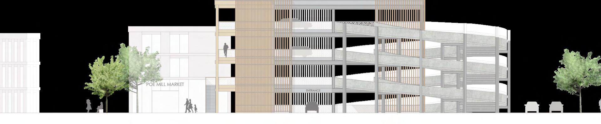Tocreateatraffic-calmedpublicspacesaroundthe property,cartrafficisaccommodatedinacentral parkinggarage.Thebuildingactsasabackbonefor thesiteandshieldsitagainstnoisefromtheneighboring railroadtracks.Thegarageoffers60short-termand 180long-termparkingspaces.Twospiralramps provideaccesstothefourparkinglevels. Inadditiontoparking,thebuildingincludesa commercialcenter,theparking+zone.Itcontainsa widerangeofbusinesspremisesforrent,suchas variousshops,officesandstudios.Thiscreatesincome opportunitiesfortheresidentsofPoeMill.Inaddition, theparking+zoneactivatesthesquareinfrontofthe buildingintoalivelypublicspace.Itcreatesa welcomingentrancetothesiteandextendspublic connectionstoAmericanSpinningMillandthePoe Millneighborhood. PoeMillhasthepotentialtobecomeavibrant communitywithanimpactontheentireregion.