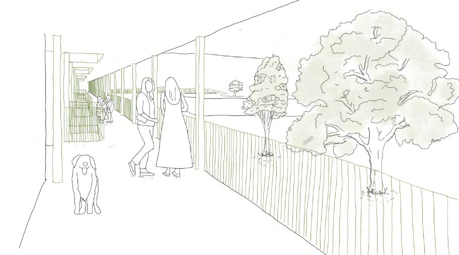 Inresponsetothenoiseoftherailway,agreenspaceisplannedtothesouthoftherailway. Italsofunctionsasapublicgreenspacewithspaceforrecreation,stormwater managementandbiodiversity.