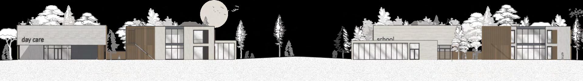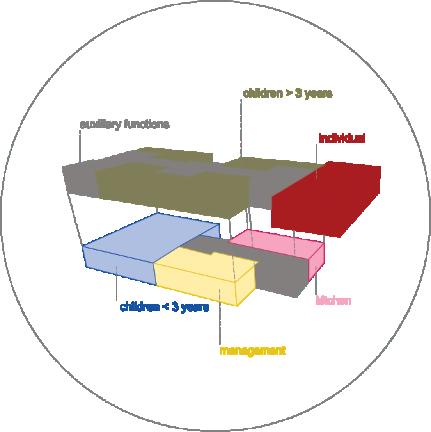 Adrop-offareabetweentheschoolanddaycarecan beusedbybothfacilities.Thedaycarehastwogroups forchildrenages1-2andsixgroupsforchildrenages 3-5,andisdividedintothreeparts:administration, olderchildrenonthesecondfloor,andyounger childrenonthefirstfloor.Themainfunctionsarelocated inlargecantileveredareas,withancillaryfunctionsin smallerareas.