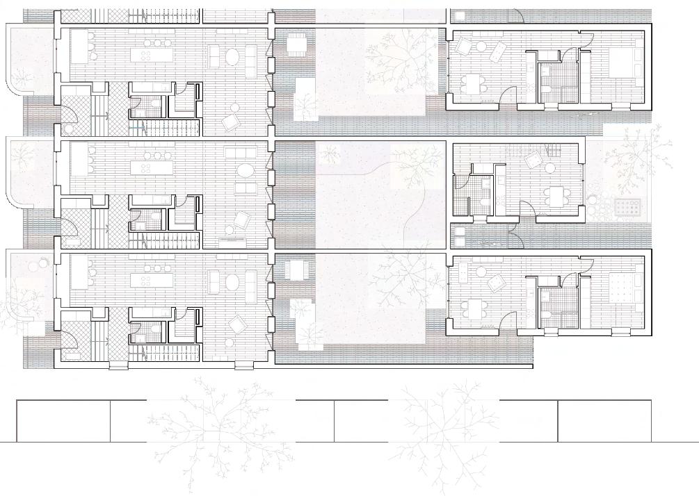 Abovearefourresidentialfloors,withtheleftmost buildinghavingonlythreetobetterintegratewiththe neighboringstructures.Thesefloorshaveroofgardens assmallprivategreenspaces.Accesstothe apartmentsonthefirstfloorisviathestaircaseandthe roofgarden,whiletheupperfloorsareaccessedvia coveredwalkways.