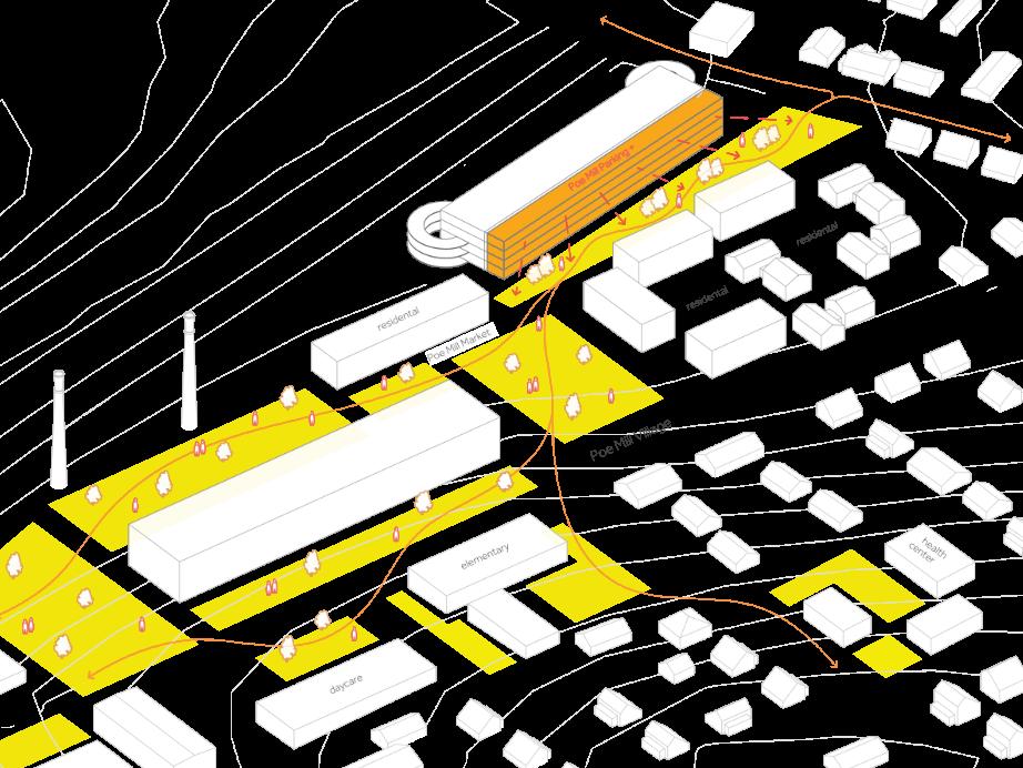 Inthe'PoeMillAlive'studio,optionsforthetransformationofthesettlementandplanning proposalsforapositivefutureforthedistrictanditsresidentsarebeingsought:Thestudio exploresalternativeapproachestoredevelopmentandreinvestmentinformertextile communitiessuchasPoeMill.Itexploresoptionsfortransformingthecommunityand presentsplanningproposalsforthefutureoftheneighborhoodanditsresidents. Overthecourseofthesemester,smallgroupsofstudentsworkedcollaborativelytodevelop differentcomprehensivemasterplansolutionsfortheneighborhood.Eventually,specific buildingsdesignsweredevelopedfromthesemasterplansasindividualdesignprojects.