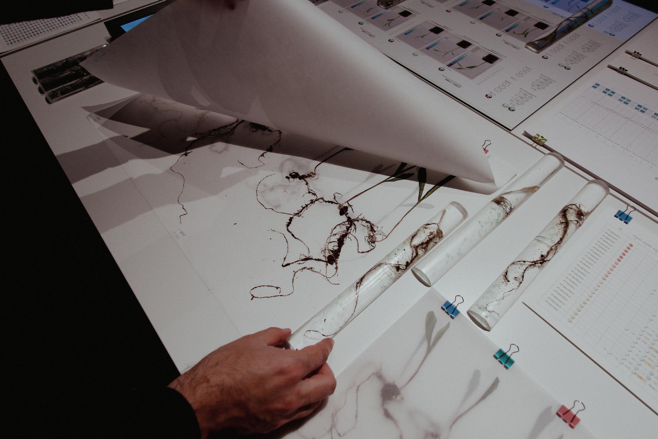 round of experiments evolved from information gleaned from the original study. Plants were harvested for stereo microscopy, fixing the specimens in resin and pressing the plants to visualize root structures. Although a small sample size, our initial results were consistent with previously published studies showing a synergistic relationship between microplastics and mycelium on plant growth. We also produced a series of artifacts from the microscopic to macroscopic scale representing various phases of the experiments.