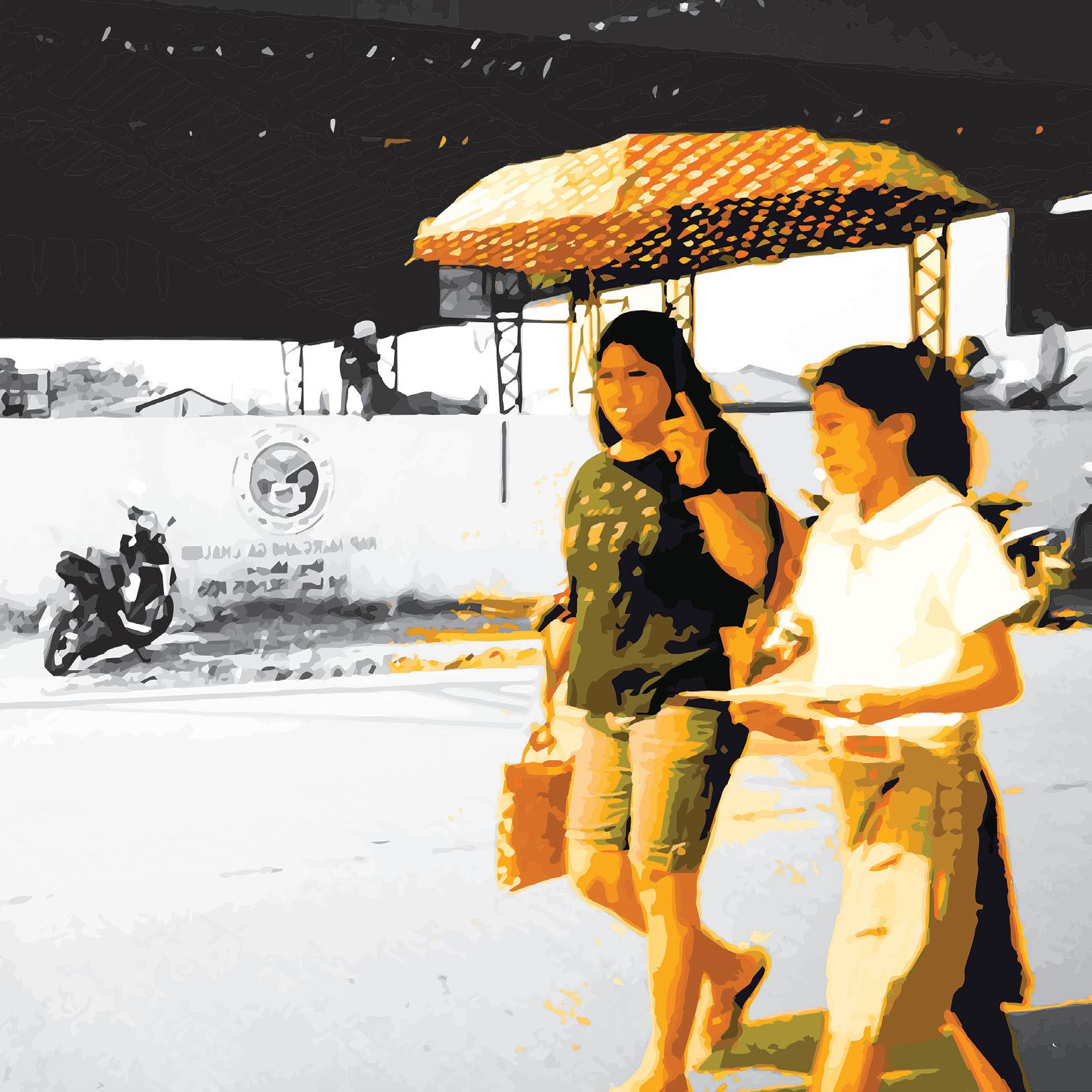 room for new apartment construction and forced the villagers who did not leave to settle informally along the public street. Often as I passed, I could see women seated on the curb fanning the flames of their small charcoal fires in preparation for lunch, while their children, with no other place to play, chased each other in the street, dodging cars, rickshaws, and the occasional push-cart vendor. The tarpaulin tents these families called home spanned the width of a public planting strip and sidewalk (a space about nine feet wide), and without private courtyards, domestic activities such as cooking and laundry were forced to take place in the street. Meanwhile, the white concrete towers of the gated enclave, with their wide balconies, loomed over the remaining trees, providing a stark contrast to the constant bustle of people living beneath their canopy.
