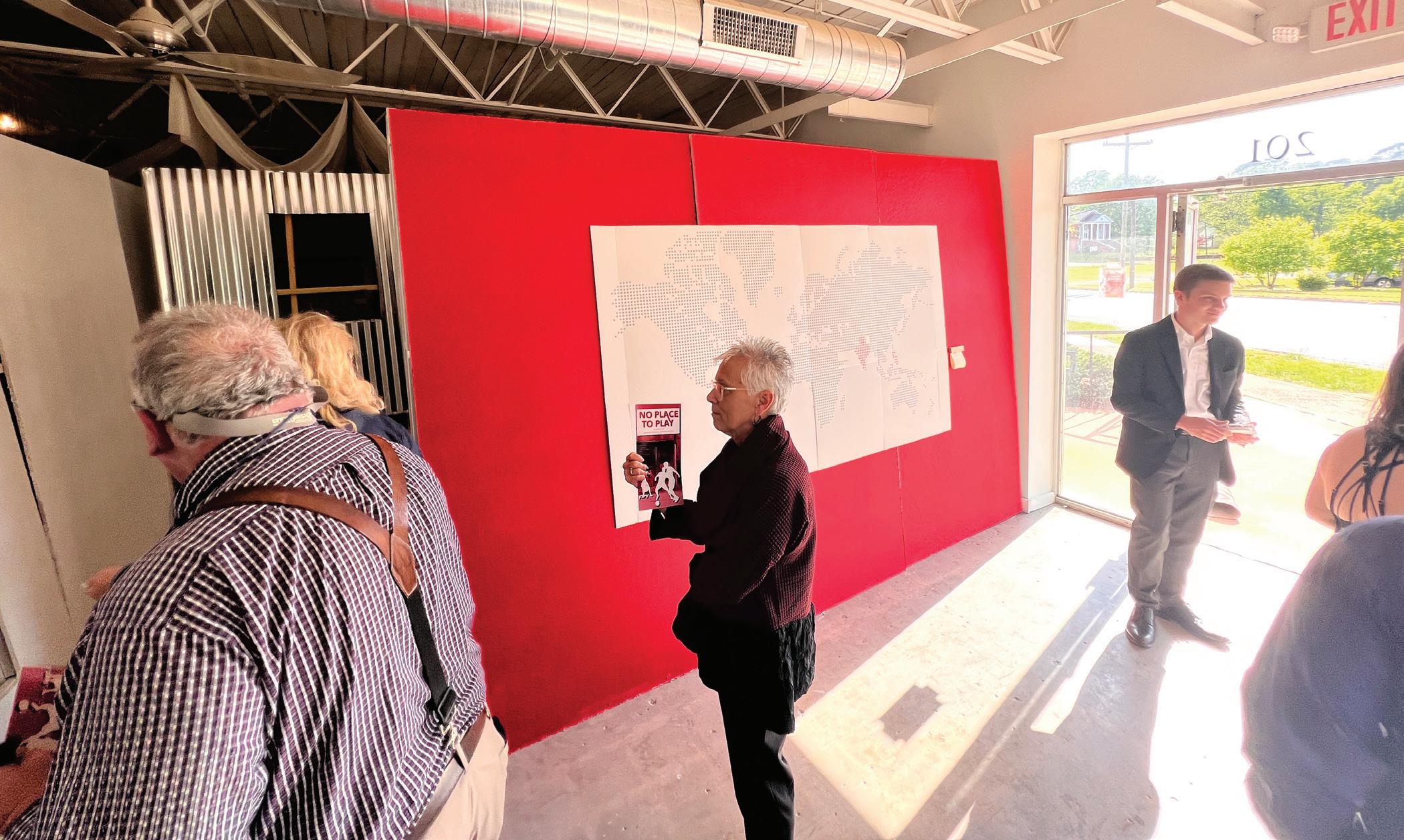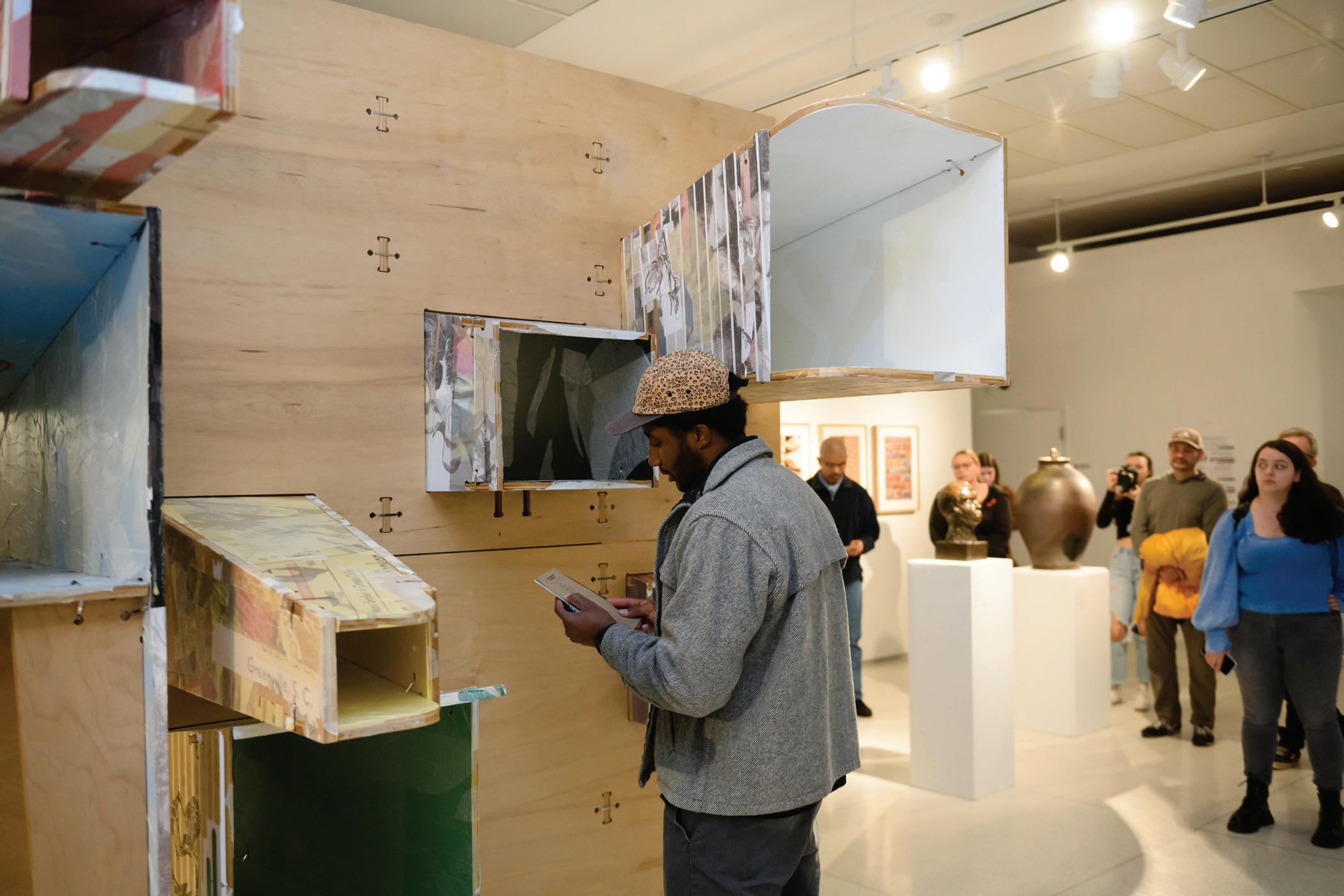 AT RIGHT: Professor Matt Nicolette and graduate student Annie Steele discuss the exhibit with Triennale visitors.