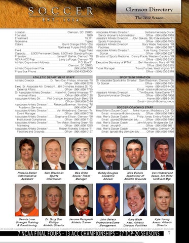 SPORTS INFORMATION Sr. Associate Sports Info. Director....Sam Blackman, Clemson '85 for Soccer................................................Office - (864) 656-1924 ............................................................... Home - (864) 639-4400 .................................................... Email - blackmj@clemson.edu Assistant Athletic Director/................ Tim Bourret, Notre Dame '77 Sports Information Director.....................Office - (864) 656-1926 ..................................................................Home (864) 888-3490 .....................................................Email - btimoth@clemson.edu SOCCER COACHING STAFF Head Men's Soccer Coach.......Mike Noonan, Middlebury Col. '83 Email: mnoonan@clemson.edu........Office - (864) 656-1945 Asst. Men's Soccer Coach............Philip Jones, Embry-Riddle '04 Email: pjones2@clemson.edu...........Office - (864) 656-1946 Asst. Men's Soccer Coach............John Murphy, Bridgewater Col. Email: jmurph9..................................Office - (864) 656-6631 Asst. Men's Soccer Coach...................Alex Prostko, Clemson '09 Email: aprostk@g.clemson.edu..........Office- (864) 656-1946