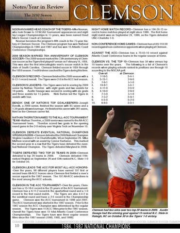 Notes/Year in Review The 2010 Season NOONAN NAMED HEAD COACH OF THE TIGERS--Mike Noonan, who took Brown to 10 NCAA Tournament appearances and eight Ivy League Championships in 15 years, was been named Head Men's Soccer Coach at Clemson. Noonan becomes the program's fifth coach in the 75-year history of Clemson Soccer. The Clemson program has won National Championships in 1984 and 1987 and has won 13 Atlantic Coast Conference Championships. 2009 SEASON MARKED 75th ANNIVERSARY OF CLEMSON SOCCER--The 2009 season marked the 75th anniversary of Clemson soccer as the Tigers first played Furman on February 14, 1934. This was also the first intercollegiate men's soccer match in the state of South Carolina. Clemson fielded soccer in 1934 through the 1939 season. Fred Kirshner coached the Tigers during this time. CLEMSON'S RECORD--Clemson finished the 2009 season with a 6-12-1 record overall. The Tigers were 2-6 in the ACC last season. CLEMSON'S LEADERS--The Tigers were led in scoring by 2009 senior by Nathan Thornton with eight goals and two assists for 18 points. Austin Savage was second in scoring with six goals and three assists for 15 points. Nick Burton led the Tigers in assists with four. BENDIK ONE OF NATION'S TOP GOALKEEPERS--Joseph Bendik, a 2009 senior, finished the season with 85 saves and a 1.39 goals allowed average. He finished his career with 281 saves, third on the Clemson career list.