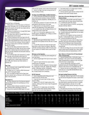 2011 season review QuickNotes: 2 4 -6 F inal Record (9-2 ACC) NCAA S weet Six teen #11 F inal ITA Ranking T wo all -americans three all - acc players Around the Team in 30 Seconds • Nancy Harris is in her 14th season as Clemson’s head coach; She holds a 237-127 all-time record, and became the school’s all-time ACC wins leader with her 85th against Florida State • Clemson has advanced to 5 straight NCAA Sweet 16s and 7 in the last 8 seasons • The Tigers have made ten straight NCAA tournament appearances and 18 overall • Clemson advanced to the Final Eight of the ITA Team Indoor Championships for the first time in school history when they knocked off #7 UCLA in the Rd. of 16 • In the current team rankings, Clemson played 9 of the top 11 teams and 12 of the top 19 overall during the 2011 season. • Bek and Keri Wong achieved the nation’s No. 1 doubles ranking for four weeks, the first time in school history that a doubles team has earned the top spot. They are curerntly ranked 6th and were both named to the All-ACC team. • Four different Tigers have amassed 22+ singles wins this year, with two others within two of 20. • The Tigers advanced out of an opponent’s region for the second time in school history, and the first since 1996, when Clemson won three matches in Columbia, SC That’s Ten! • This is Clemson’s tenth straight NCAA Tournament Appearance and 18th all-time • The Tigers are 24-17 overall in NCAA Tournament play and 21-9 during the streak • This is the eighth straight time the Tigers have earned a national seed, as Clemson is the 15th overall seed in the tournament How Sweet It Is • The Tigers advanced out of the Arkansas regional, defeating Wichita State (4-0) and Arkansas (4-2) to get to Stanford • Sophomore Nelly Ciolkowski provided the winning point, defeating Kate Lukomskaya in three sets. • Clemson has reached the NCAA Sweet 16 in each