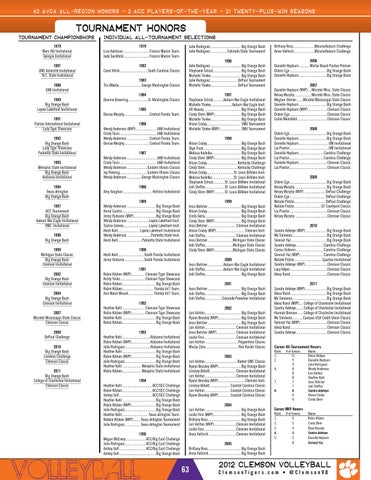 2007 Danielle Hepburn (MVP).... Microtel Miss. State Classic Kelsey Murphy................... Microtel Miss. State Classic Meghan Steiner........Microtel Mississippi State Classic Danielle Hepburn............................... Big Orange Bash Danielle Hepburn (MVP)......................Clemson Classic Didem Ege...........................................Clemson Classic Leslie Mansfield..................................Clemson Classic 2008 Didem Ege.......................................... Big Orange Bash Danielle Hepburn............................... Big Orange Bash Danielle Hepburn................................. UNI Invitational Lia Proctor............................................ UNI Invitational Danielle Hepburn............................Carolina Challenge Lia Proctor.......................................Carolina Challenge Danielle Hepburn................................Clemson Classic Lia Proctor...........................................Clemson Classic 2009 Didem Ege.......................................... Big Orange Bash Kelsey Murphy.................................... Big Orange Bash Kelsey Murphy (MVP) ........................ DePaul Challenge Didem Ege........................................ DePaul Challenge Natalie Patzin................................... DePaul Challenge Natalie Patzin.............................. GT Courtyard Classic Lia Proctor...........................................Clemson Classic Kelsey Murphy.....................................Clemson Classic 2010 Sandra Adeleye (MVP)........................ Big Orange Bash Mo Simmons...................................... Big Orange Bash Serenat Yaz........................................ Big Orange Bash Sandra Adeleye...............................Carolina Challenge Cansu Ozdemir................................Carolina Challenge Serenat Yaz (MVP)...........................Carolina Challenge Natalie Patzin............................... Spartan Invitational Sandra Adeleye (MVP).........................Clemson Classic Lacy HAyes..........................................Clemson Classic Alexa Rand..........................................Clemson Classic 2011 Sandra Adeleye (MVP)........................ Big Orange Bash Alexa Rand......................................... Big Orange Bash Mo Simmons...................................... Big Orange Bash Alexa Rand (MVP)..... College of Charleston Invitational Sandra Adeleye........ College of Charleston Invitational Hannah Brenner....... College of Charleston Invitational Mo Simmons............Campus USA Credit Union Classic Serenat Yaz (MVP)...............................Clemson Classic Alexa Rand..........................................Clemson Classic Sandra Adeleye...................................Clemson Classic Career All-Tournament Honors Rank 1. 2. 4. 7. 8.