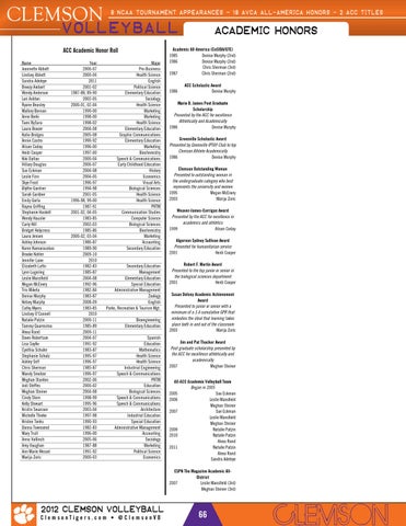 Marie B. James Post Graduate Scholarship Presented by the ACC for excellence Athletically and Academically 1986 Denise Murphy Greenville Scholastic Award Presented by Greenville IPTAY Club to top Clemson Athlete Academically 1986 Denise Murphy Clemson Outstanding Woman Presented to outstanding woman in the undergraduate category who best represents the university and women 1995 Megan McEnery 2003 Marija Zoric Weaver-James-Corrigan Award Presented by the ACC for excellence in academics and athletics 1999 Alison Coday Algernon Sydney Sullivan Award Presented for humanitarian service 2001 Heidi Cooper Robert F. Martin Award Presented to the top junior or senior in the biological sciences department 2001 Heidi Cooper Susan Delony Academic Achievement Award Presented to junior or senior with a minimum of a 3.4 cumulative GPR that embodies the ideal that learning takes place both in and out of the classroom 2003 Marija Zoric Jim and Pat Thacker Award Post graduate scholarship presented by the ACC for excellence athletically and academically 2007 Meghan Steiner All-ACC Academic Volleyball Team Began in 2005 2005 Sue Eckman 2006 Leslie Mansfield Meghan Steiner 2007 Sue Eckman Leslie Mansfield Meghan Steiner 2009 Natalie Patzin 2010 Natalie Patzin Alexa Rand 2011 Natalie Patzin Alexa Rand Sandra Adeleye ESPN The Magazine Academic AllDistrict 2007 Leslie Mansfield (3rd) Meghan Steiner (3rd)