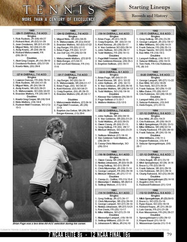 1984 (27-9 OVERALL, 7-0 ACC) Singles 1. Lawson Duncan, FR (36) 70-14 2. Rick Rudeen, SR (34) 41-23 3. Miguel Nido, JR (34) 38-18 4. Andy Krantz, SR (32) 29-21 5. R. Matuszewski, SO (36) 50-22 6. Brandon Walters, FR (23) 38-11 Doubles 1. Krantz-Greg Cooper, SR (16) 13-8 2. Nido-Walters, (19) 16-8 3. Rudeen-Matt Frooman, SO (15) 13-5