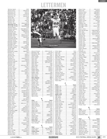 McCloud, Gerald 1 2003 McClure, Bruce 3 1963,64,65 * McConnell, H.S. 2 1914,15 * McConnell, R.E. 2 1925,26 McConnell, S.W. 3 1934,35,36 * McConnell, T.S. 3 1934,35,36 McCory, Bob 1 1944 McCown, Fred 1 1942 McCown, Slick 2 1933,34 * McCown, T.M. 1 1918 McCrorey, Andye 4 1992,93,94,95 McCullough, Jay Jay 2 2013,14 McCullough, Richard 4 1985,86,87,88 McCurty, Damon 1 1979 McDaniel, DeAndre 4 2007,08,09,10cc McDaniel, Ed 4 1988,89,90,91 McDermott, John 3 1998,99,00 McDowell, Garry 2 1974,75 McDowell, Roderick 4 2010,11,12,13 McDuffie, Chris 4 2004,05,06,07 McElmurray, Mac 3 1964,65,66 McElrathbey, Ray Ray 1 2006 McElveen, Donny 1 2013 * McElveen, Norwood 3 1939,40,41 * McFadden, Banks 3 1937,38,39 * McFadden, R.D. 1 1908 * McFadden, R.H. (Doc) 2 1906,07 McFadden, Wesley 4 1985,87,88,89cc McGee, Edgar 3 1965,66,67 * McGill, C.A. 1 1925 * McGlockton, Chester 3 1989,90,91 * McGlone, T.F. 1 1926 McGuirt, Bill 2 1960,61 McInally, Chris 2 1993,95 * McIver, Rick 2 1904,05 McKelvey, J.J. 4 1999,00,01,02 McKenney, Pat 2 1985,86 McKenzie, Damonte 4 1995,97,98,99 * McKenzie, W.W. 1 1918 * McKeown, J.A. 1 1903 McKissic, Jock 4 2005,06,07,08cc McLane, Riley 2 1966,67 McLaurin, Duncan 1 2005 McLaurin, Jewell 2 1969,70 * McLaurin, J.N. 4 1904,05,06,07c McLees, Jimmy 2 1990,91 McLellan, Bill 2 1953,54 McLellan, Cliff 1 1981 * McLendon, Ed 1 1939 * McLendon, Lem 1 1955 McLeod, Matt 2 1996,97 McMahan, Dave 2 1969,70 McMakin, John 3 1969,70,71cc * McMillan, Goat 2 1928,29 McMillan, Raiford 3 1926,27,28 * McMillan, W.L. (Red) 3 1913,14,15 McNeal, Bryant 4 1999,00,01,02cc McNeal, Bryce 1 2010 McSwain, Chuck 4 1979,80,81,82 McSwain, Rod 4 1980,81,82,83 Meadowcroft, Charlie 3 1963,64,65 Meadows, Dwayne 3 1984,85,86 Means, Harold 3 1996,97,98 Medlin, Jamal 1 2008 Medlin, Rick 3 1967,68,69 Meekins, Eric 4 1999,00,01,02 Meeks, Chuck 1 1982 Meeks, Jonathan 4 2009,10,11,12cc * Mellette, F.M. 1 1911 * Melton, L.H. (Doc) 2 1923,24 Merling, Phillip 3 2005,06,07 Merritt, Will 4 1998,99,00,01 Merriweather, Reggie 4 2003,04,05,06 Michael, Benny 3 1966,67,68 * Midkiff, Bob 1 1926 Miller, Bill 1 1962 Miller, Billy 1 1943 * Miller, Bob 2 1931,32c * Miller, H.E. 2 1937,38 * Miller, Jack 3 1944,47,48 Miller, Jim 1 1948 Miller, Josh 4 2005,06,07,08 Miller, Justin 3 2002,03,04 Miller, Ron 1 1958 Miller, Tif 1 2001 Mills, Jeff 2 1974,75 Milton, Eldridge 4 1981,83,84,85 Milton, Fred 3 1968,69,70 * Mimms, Charlie 1 1946 Mitchell, Joedy 1 1996