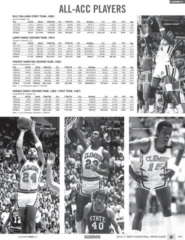 Guard • Rutherfordton, N.C. Year GP-GS Min/G FGM-FGA Pct. FTM-FTA Pct. Reb/Avg. A-T B-S PTS Avg. 1980-81 31-22 884/29 113-211 .536 46-63 .730 70/143/4.6 80-36 2-37 272 8.8 1981-82 28-28 992/35 181-309 .586 58-72 .806 64/135/4.8 84-52 0-32 420 15.0 1982-83 3-3 114/38 18-36 .500 9-12 .750 4/14/4.7 6-3 0-2 46 15.3 1983-84 25-24 854/34 152-301 .505 51-76 .671 60/136/5.4 76-68 2-29 355 14.2 1984-85 29-28 1062/36 188-387 .486 61-76 .803 84/200/6.9 91-75 2-33 437 15.1 TOTALS 116-105 3906/34 652-1244 .524 225-299 .753 282/628/5.4 337/234 6-133 1530 13.2 Note: 1-1 on three-point goals in 1982-83.