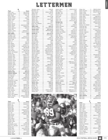 LETTERMEN A Player VL Year(s) Aaron, Jack 3 1961,62,63 Abdullah, Rahim 3 1996,97,98 * Abell, Frank 2 1931,32 Abney, Terrence 1 1992 Abrams, Jimmy 2 1966,67 Adams, Eddie 1 2008 * Adams, J.P. 3 1914,15,16 Abreu, Ed 1 1978 Adams, Dymon 1 1998 * Adams, Gaines 4 2003,04,05,06cc Adams, Keith 3 1998,99,00 Adams, Spencer 2 2009,10 Adams, Rod 1 1991 Addison, Jimmy 3 1965,66,67cc * Adkins, Gary 4 1976,77,78,79 Aiken, Martin 1 2013 Albergotti, Toby 1 2002 Alexander, Gary 3 1973,74,75 Alexander, Kevin 4 2006,07,08,09 Alford, Hugh 1 1945 * Alford, J.L. 1 1916 * Aliffi, Vic 2 1961,63 * Allen, Banks 2 1906,07 Allen, Dwayne 3 2009,10,11 Allen, Michael 4 1995,96,97,98 Allen, Terry 3 1987,88,89 Allen, Thad 4 1974,75,76,77 Alley, Kendall 3 1981,82,83 * Allison, J.W. (Switzer) 4 1917,18,19,20 Altman, Ed 2 1996,97 Ammons, Billy 3 1966,67,68cc Anderson, Ben 3 1970,71,72 Anderson, Jack 3 1968,69,70 * Anderson, Joe 3 1960,61,62 * Anderson, Randy 3 1985,86,87 Anderson, Sam 3 1958,59,60 Anderson, Tony 3 1970,71,72 Anderson, Willie 3 1972,73,74cc Andreas, Karl 3 1971,72,73 Andreo, Ron 3 1959,60,61cc Andrews, Daniel 4 2008,09,10,11 Ankuta, Neuf 2 1954,55 Anthony, Shaq 2 2012,13 Anthony, Stephone 3 2011,12,13 Anthony, Vernie 2 1981,82 Ard, Wendall 2 1943,44 Ardley, Alex 3 1998,99,00 Ariri, Obed 4 1977,78,79,80 * Armstrong, F.E. (Boo) 3 1918,19,20c * Armstrong, Hoyt 1 1921 Armstrong, Junior 1 1930 Armstrong, Lon 3 1959,60,61 Arrington, Vandell 3 1981,82,83 * Arthur, Gary 3 1966,67,68 * Asbill, Henry 3 1927,28,29 Ashe, Terrance 4 2007,08,09,10 Austin, Cliff 4 1978,80,81,82 Austin, Javis 2 1997,98 * Austin, P.B. (Plowboy) 2 1925,26 Austin, Thomas 4 2006,07,08,09cc * Avery, Wingo 3 1953,54,55ac