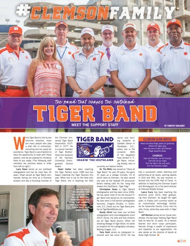 hile Tiger Band is led by two full-time directors, there are many people who play a vital role in instruction, recruiting and our quest for excellence. Tiger Band is very thankful to have the opportunity to work with these experts, and we are pleased to introduce them to you today. (The following staff members are pictured above in order from left to right.) Larry Sloan serves as our overhead videographer and has for more than 35 years. Sloan served as Tiger Band commander during his time as a Clemson student and was a founding member of